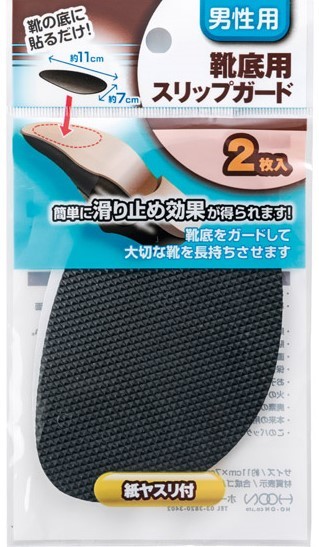 男性用。紙ヤスリ付き。靴底用スリップガード。靴底に貼るだけで簡単に滑り止め効果が得られます。