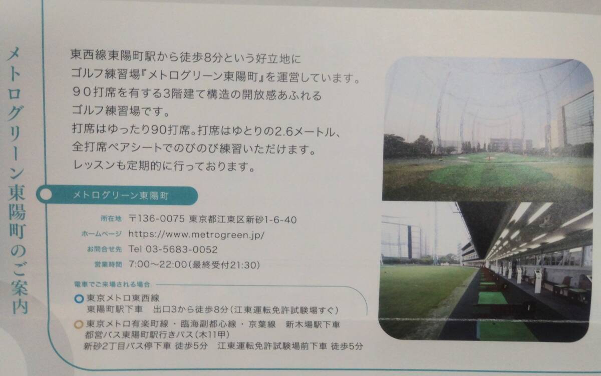 ②ゴルフ練習場メトログリーン東陽町入場無料券×5枚 【有効期限2026.6.30】