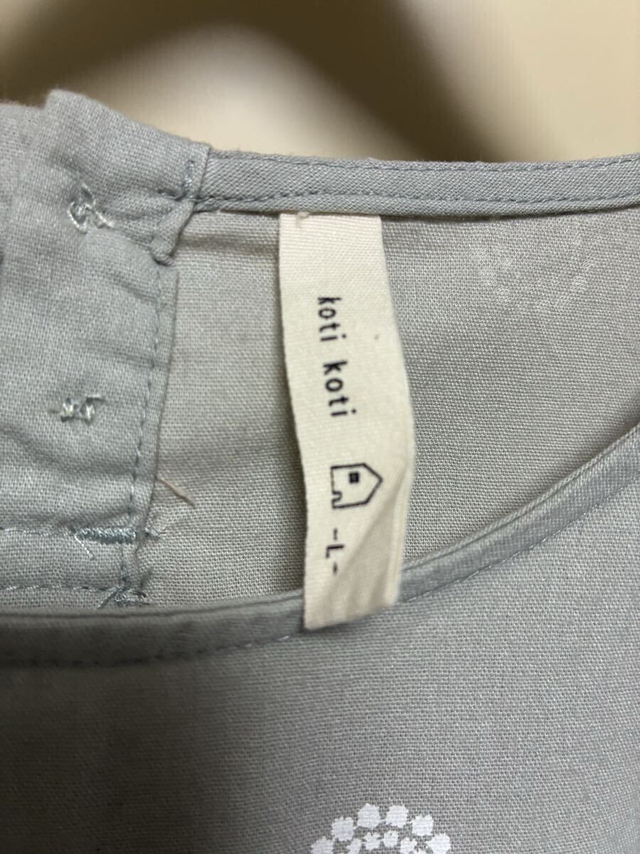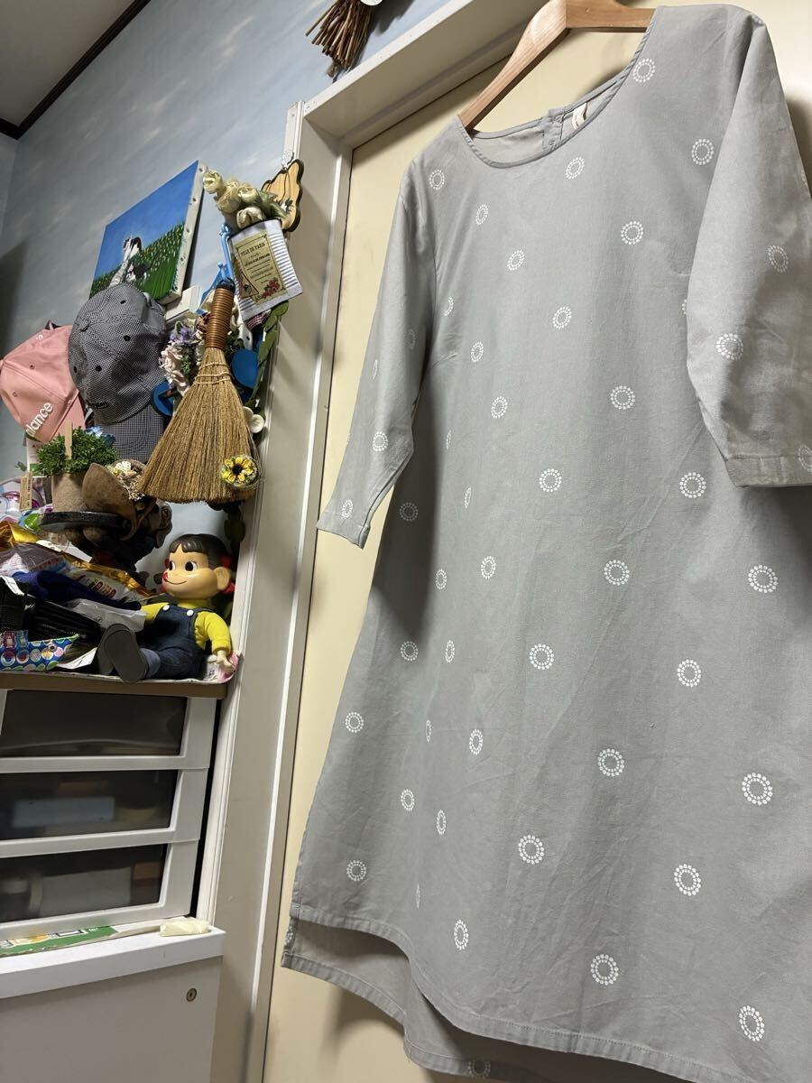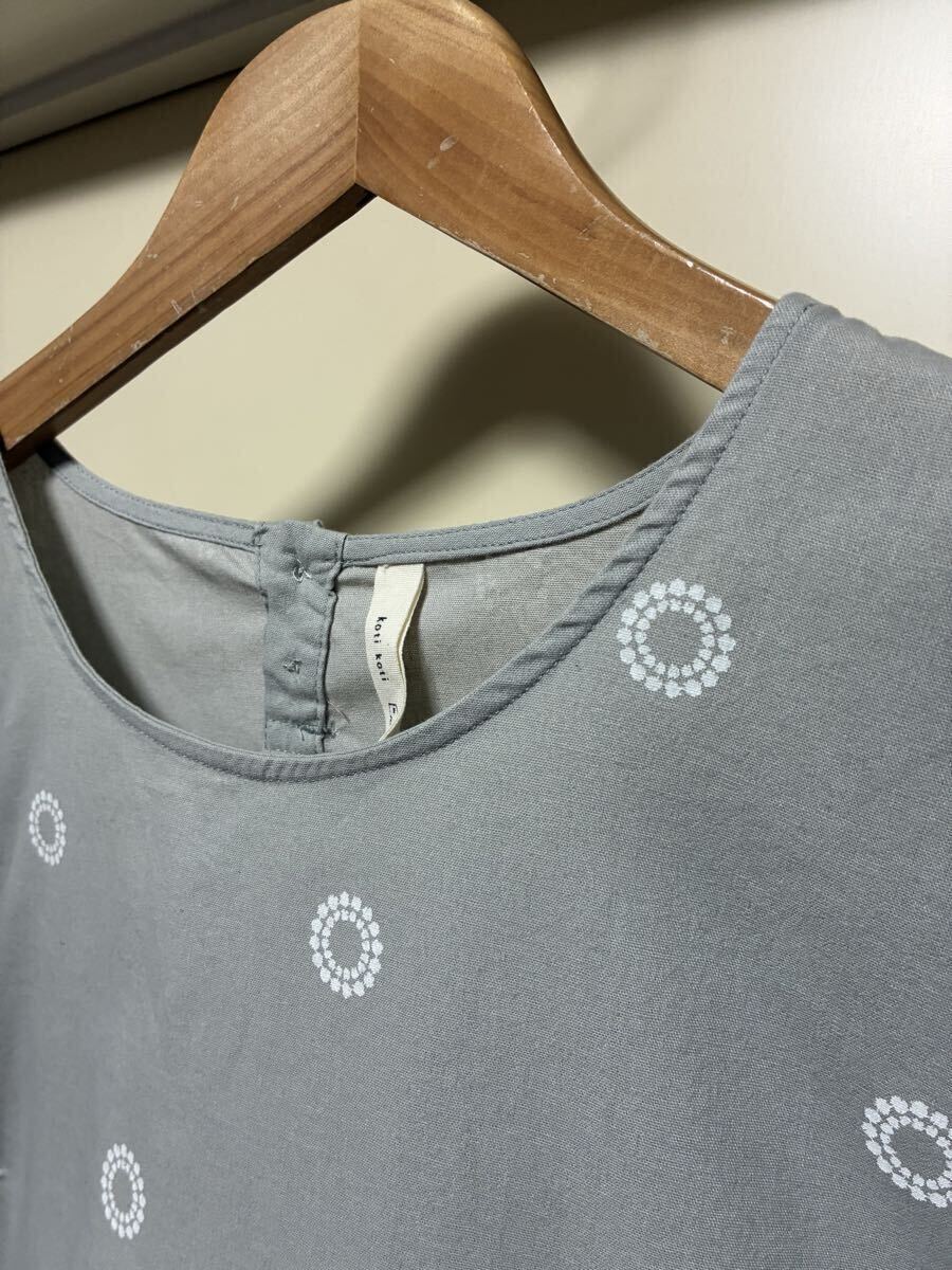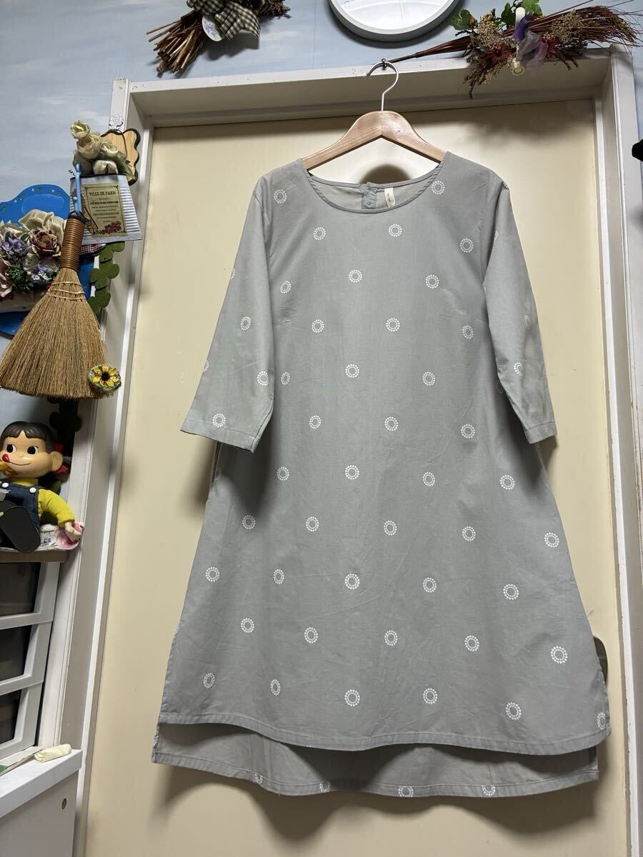 ★koti koti★優しい色合いでドット柄がお洒落な揺ったりワンピースになります。ライトグレーを基調とした色合いでホワイトのお洒落なドット柄プリントが全体的にほどこされています。ウエスト辺りの両サイドにはポケットが付いていて裾辺りの両サイドにはスリットがはいっています。後ろ側の中心はくるみボタンになっていて着丈は後ろ側がやや長めになっています。シンプルながらコットン100%のお洒落な一枚に仕上がっています。