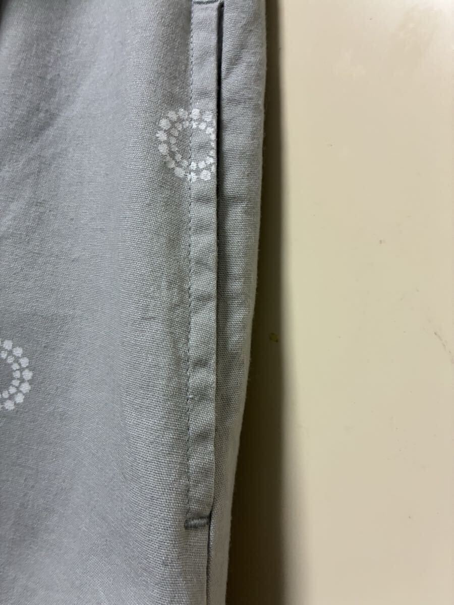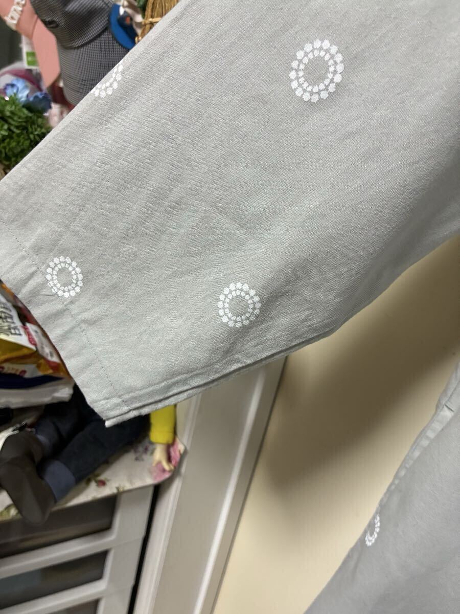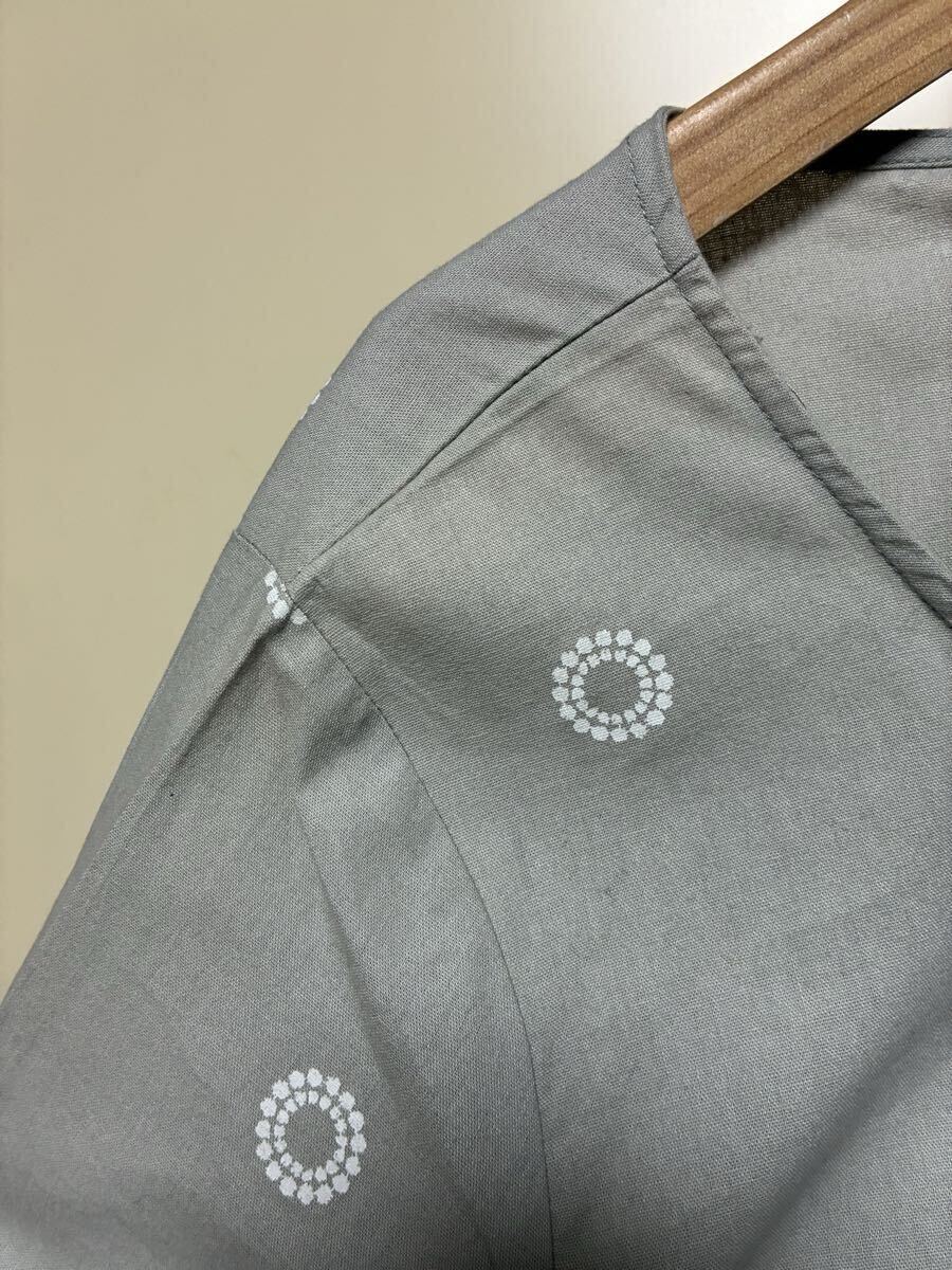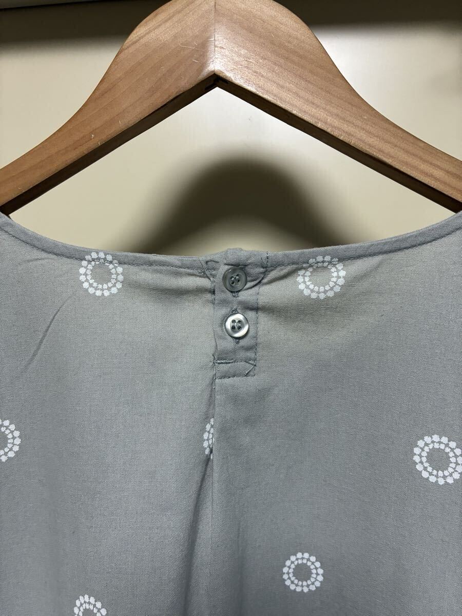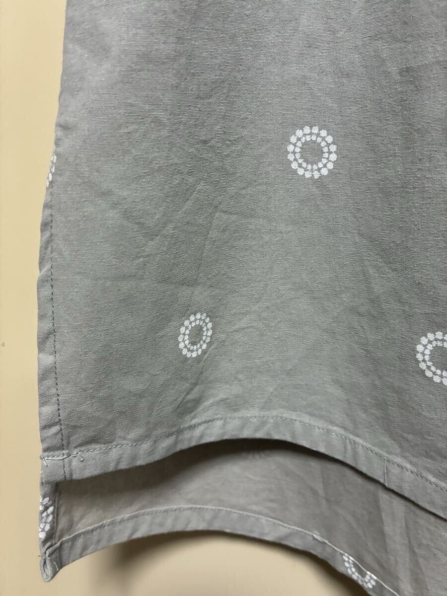 ★koti koti★優しい色合いでドット柄がお洒落な揺ったりワンピースになります。ライトグレーを基調とした色合いでホワイトのお洒落なドット柄プリントが全体的にほどこされています。ウエスト辺りの両サイドにはポケットが付いていて裾辺りの両サイドにはスリットがはいっています。後ろ側の中心はくるみボタンになっていて着丈は後ろ側がやや長めになっています。シンプルながらコットン100%のお洒落な一枚に仕上がっています。