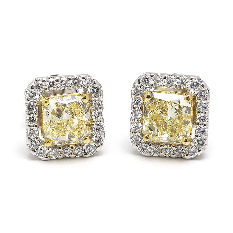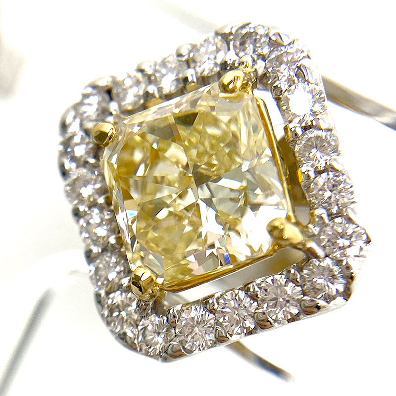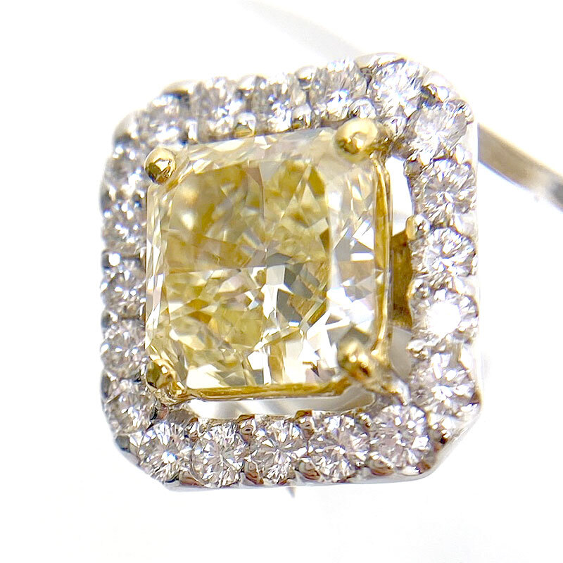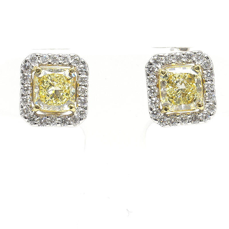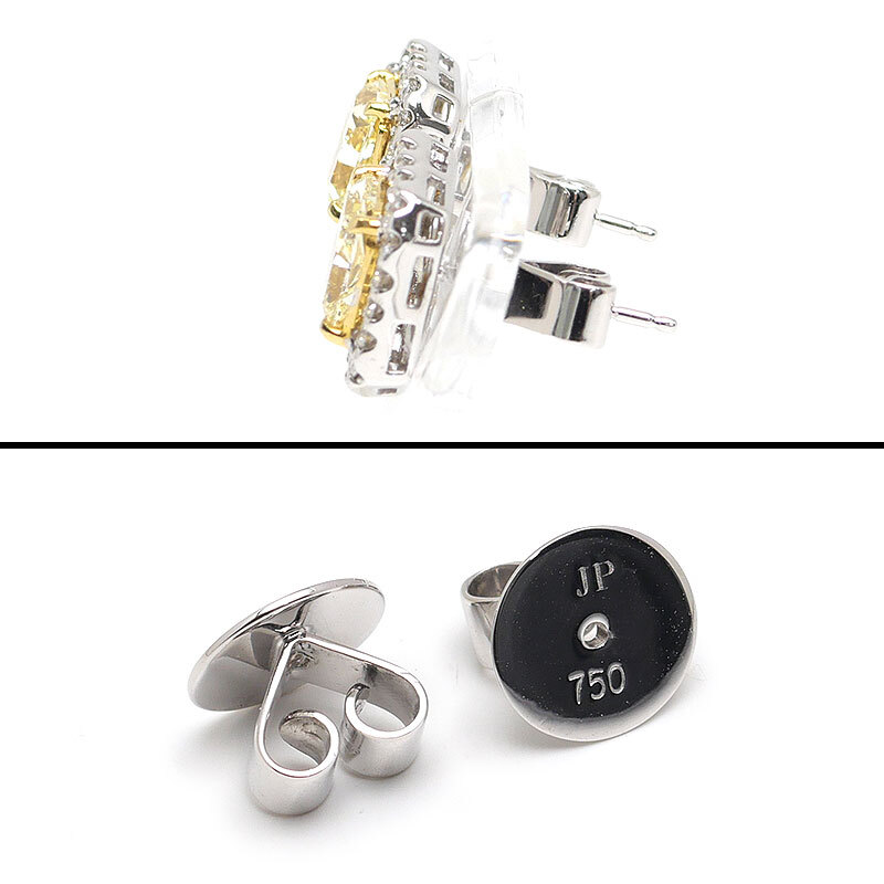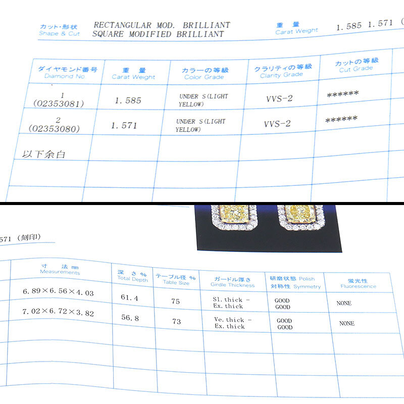 ・片方で1.5カラット超の大粒ダイヤピアス。中石のグレードはカラーがUNDER S(LIGHT YELLOW)、クラリティがVVS2です。使用の際に気になるダメージのない美品です。