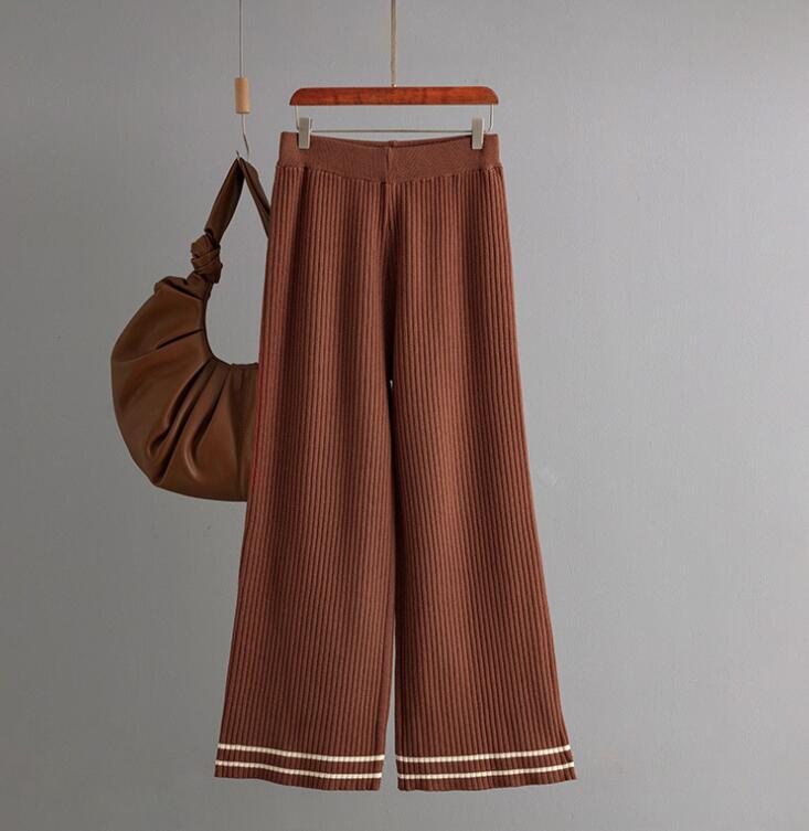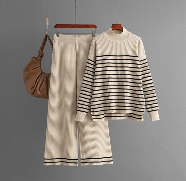 344  パンツスーツladiesレディース ◇ ニット素材  厚手  ◇   上質  秋冬  ボーダー柄    ベージュ