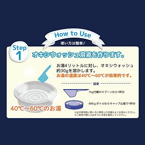 商品説明 | ▼オキシウォッシュ酸素系漂白剤とは : 粉末タイプの酸素系漂白剤です。漂白・除菌・消臭に使えます。洗濯、食器漂白、掃除などマルチに活用できます。独自処方による洗浄力の高さが強みです。油汚れにもOK。40〜60度のお湯に溶かし、つけ置くことで更に効果が上がります。 ▼効果的なご使用方法 : 40〜60度のお湯でご使用いただくと効果的です。しつこい汚れにはオキシウォッシュの量を増やしてお使いいただくと効果的です。※水でご使用される場合は、本剤を少量のお湯で溶かしてから、水と混ぜてご使用ください。使用上の注意をよくお読みください。 ▼お洗濯の場合 : 衣類のガンコな汚れ・汗ジミ・黄バミなどに。※衣類についている洗濯表示に従ってご使用ください。 ▼つけ置き洗いの場合 : 食器の茶シブ・台所用ふきん・エアコンフィルターなどに。 ▼シミぬきの場合 : 衣類やカーペットに付いた食べこぼし・血液・ペットによるシミに。 ▼使えるもの : 洗濯物(衣類)、カーテン、ナイロンのカーペット(ウール・ウール混紡製には使用不可)、食べこぼし、食器の茶渋、タバコのヤニ、血液、醤油、浴室の目地、玄関のタイル、植物による汚れ、ペットによる汚れ、ニオイ等。 ▼使えないもの : ウール製品、ウール混紡、ウール製カーペット、ペルシャ製カーペット、畳、シルク、革製品などの水洗いできないもの。 ▼内容量 : 1kg ▼液性 : 弱アルカリ性 ▼用途 : 衣類・布製品・台所まわり・水まわり・食器・タイル ▼成分 : 過炭酸塩(酸素系)、炭酸塩、水軟化剤、過硫酸塩、界面活性剤 ▼原産国 : 日本