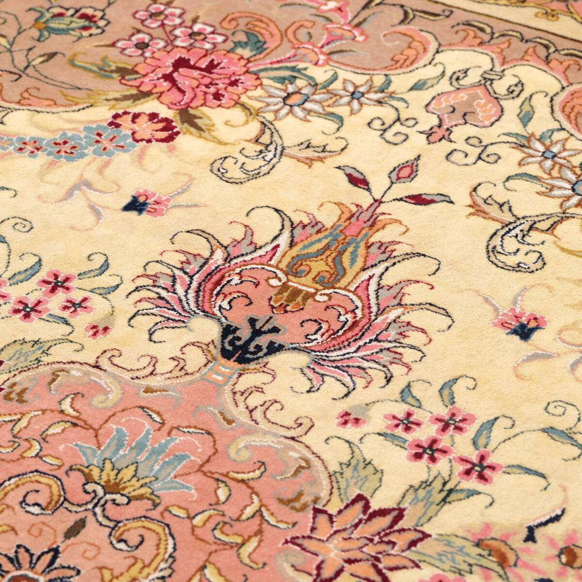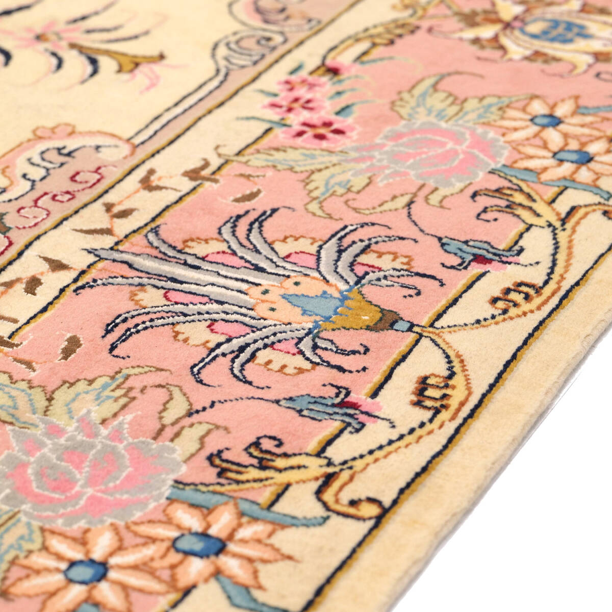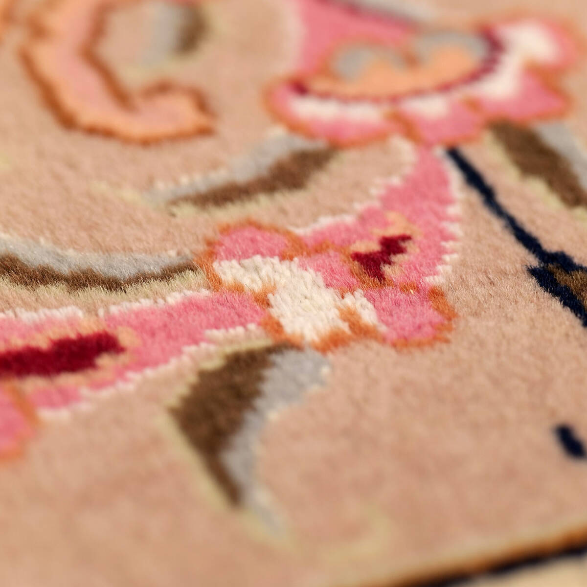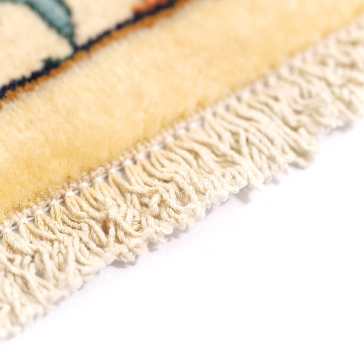 ウールとシルクの混紡による織りは、柔らかな質感としなやかな光沢を実現しています。クラシカルなメダリオンと豊かな花柄の構成は、リビングや応接間に格調高い雰囲気を与え、インテリアの中心となる一枚です。
