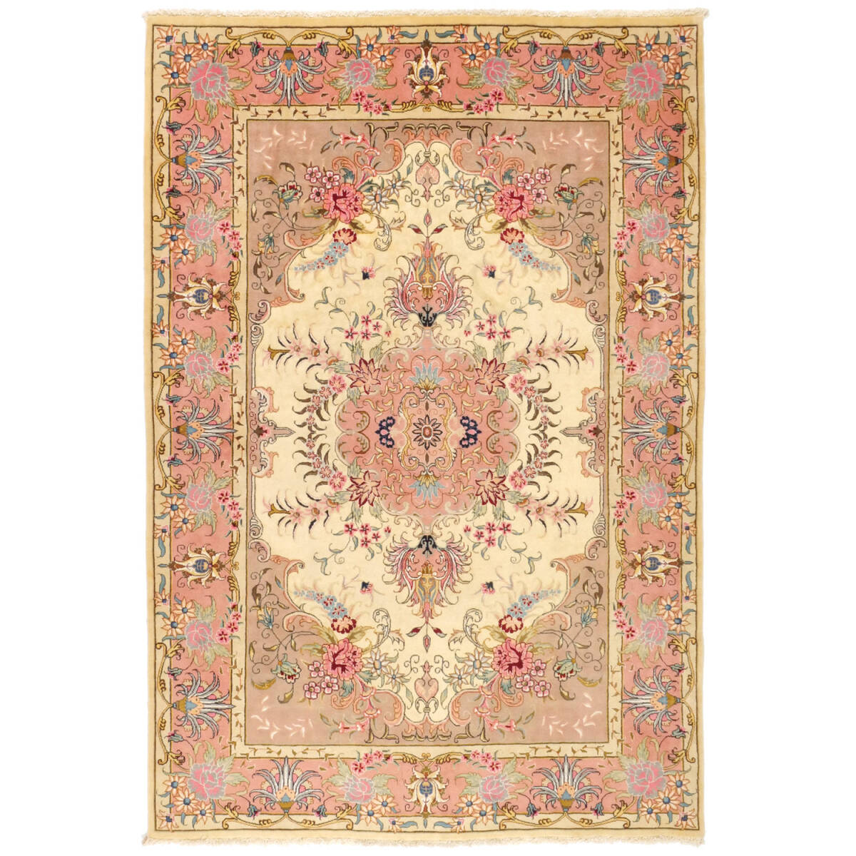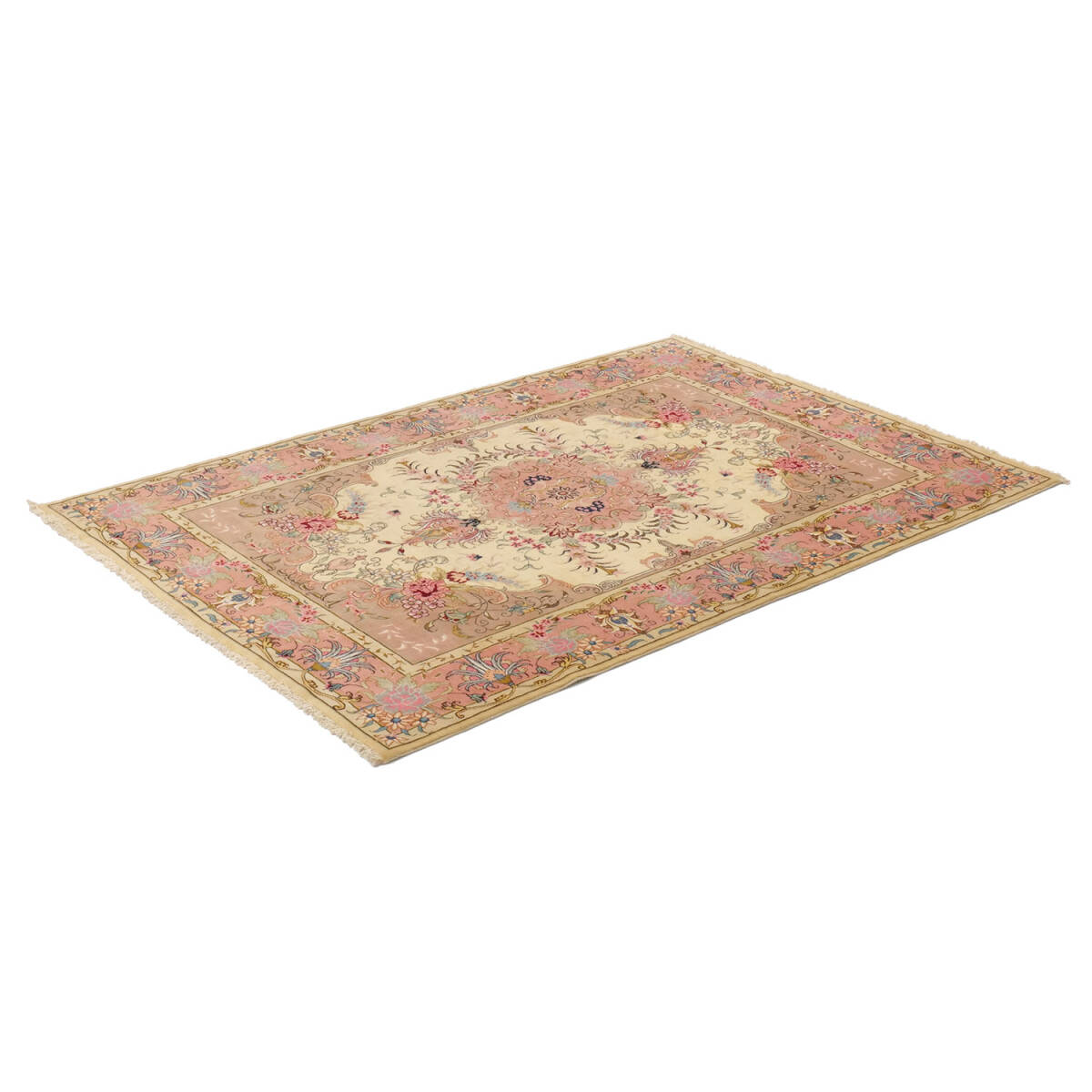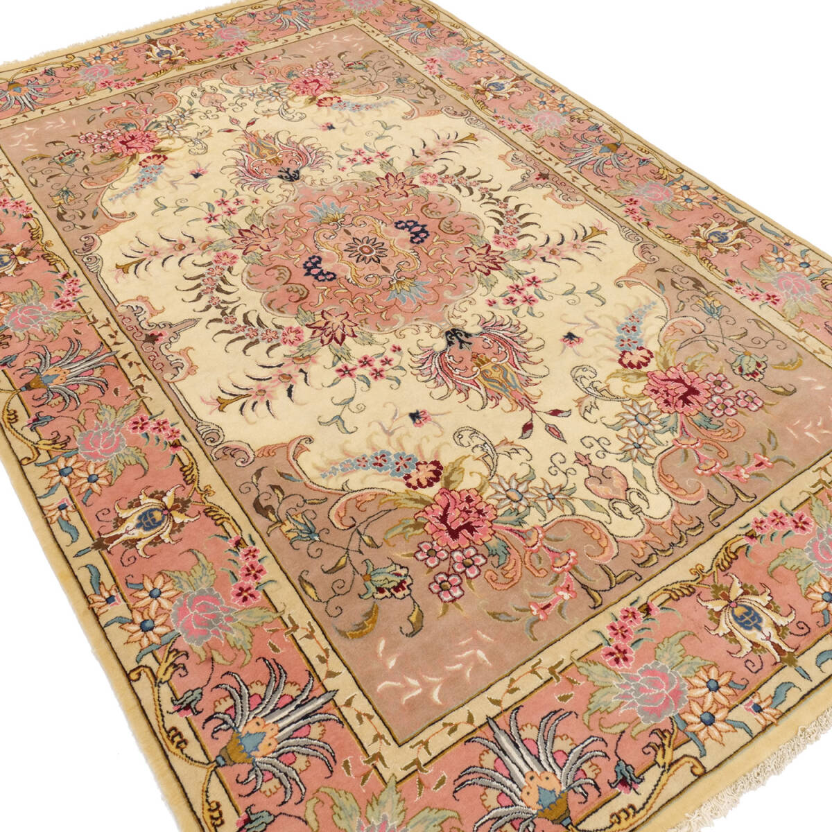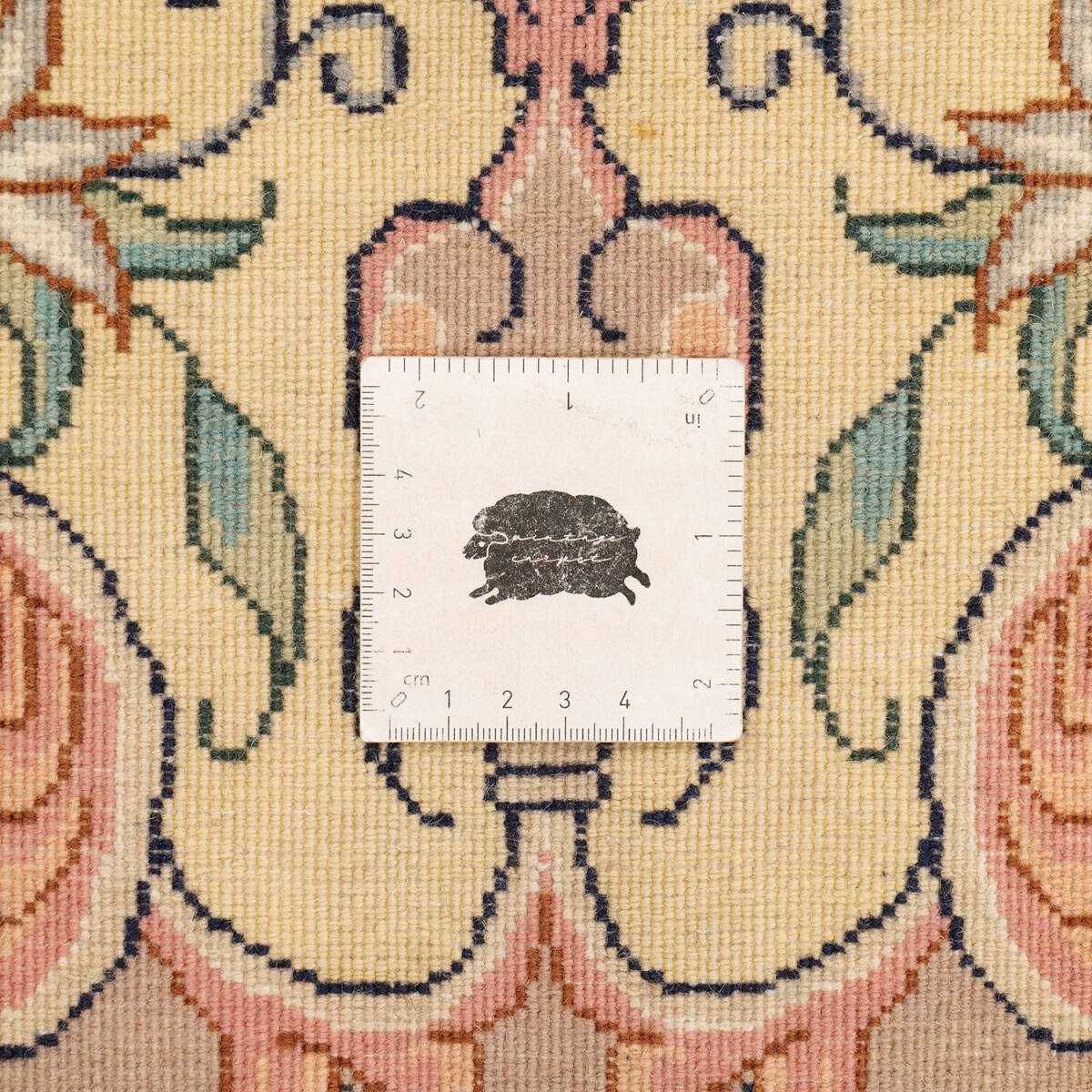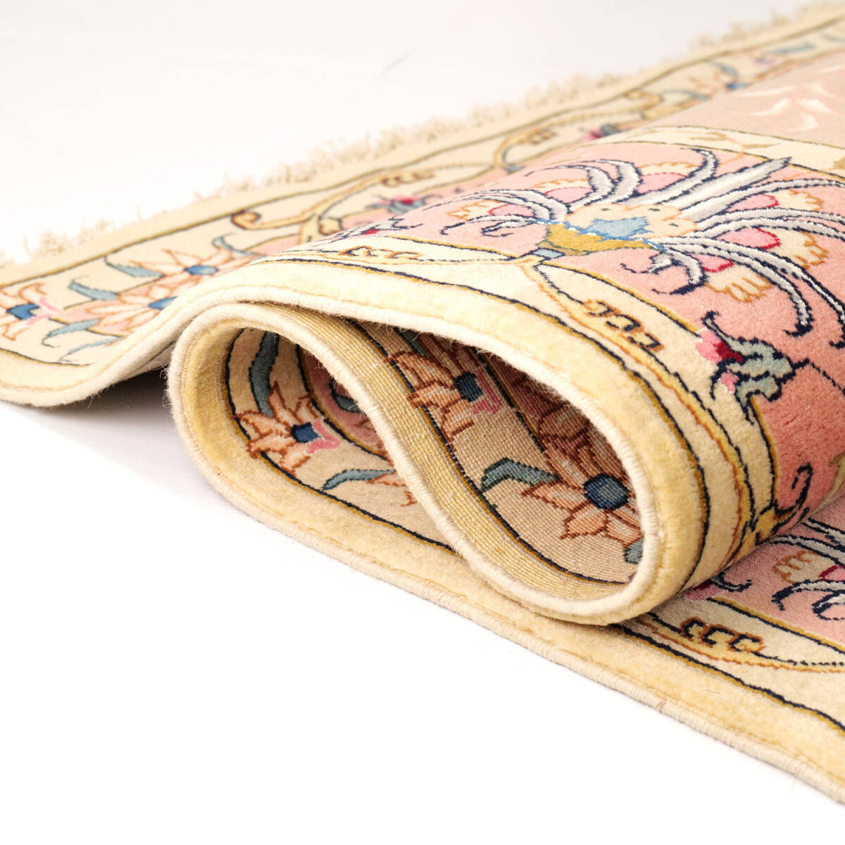 ウールとシルクの混紡による織りは、柔らかな質感としなやかな光沢を実現しています。クラシカルなメダリオンと豊かな花柄の構成は、リビングや応接間に格調高い雰囲気を与え、インテリアの中心となる一枚です。