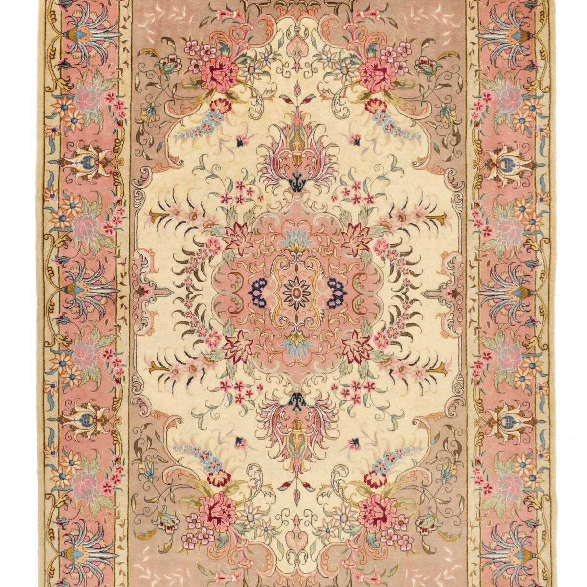 1960年代に制作されたカシャン産のセミアンティークラグです。中央の大きなメダリオンを中心に、花々やエスリム(唐草)のように流れる文様が優雅に広がり、宮廷絨毯のような気品を感じさせます。シルクの光沢が織り込まれているため、光の当たり方によって柔らかく上品な輝きを放ちます。