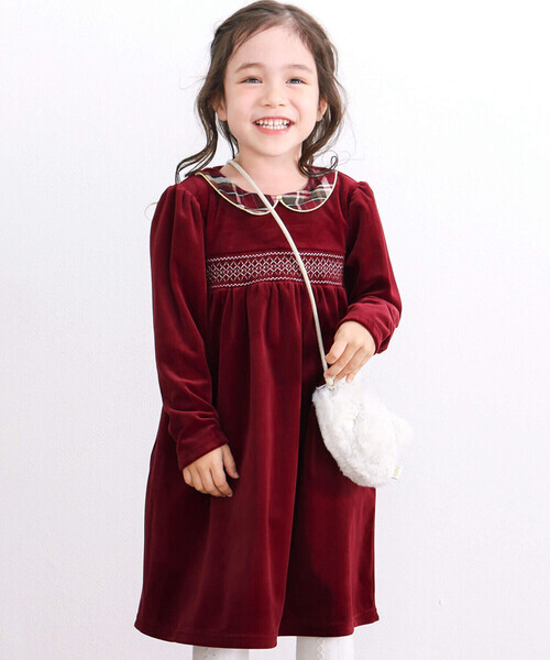 参考商品名:チェック襟付きスモッキングベロアワンピース(80~130cm)