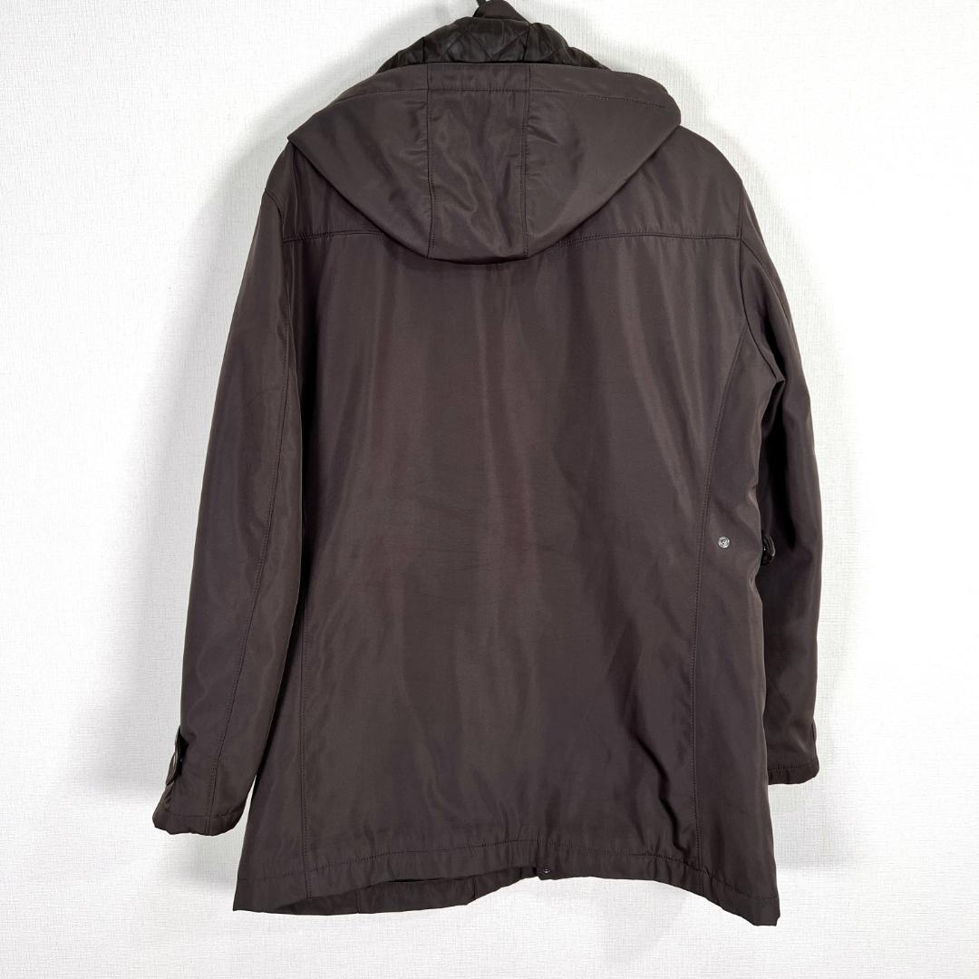 男性用のダークブラウン系の中綿入りジャケット フード付きコート ジャンパー ブルゾン アウターです。美品で、目立つような傷や汚れもなくまだまだ使っていただけます。古着 株式会社しまむら