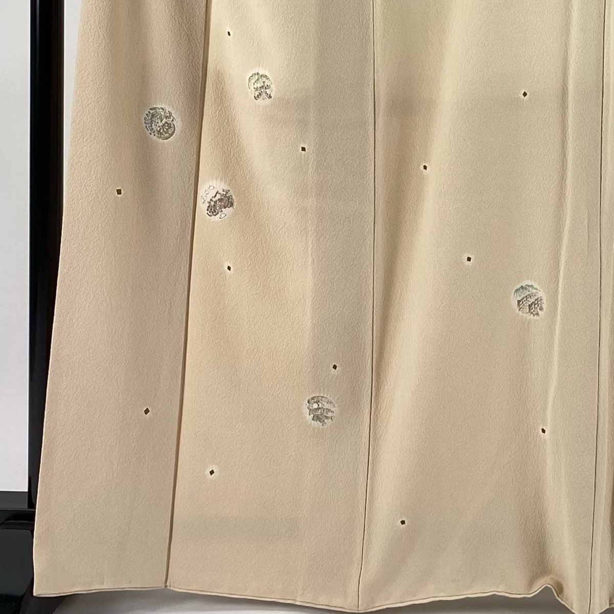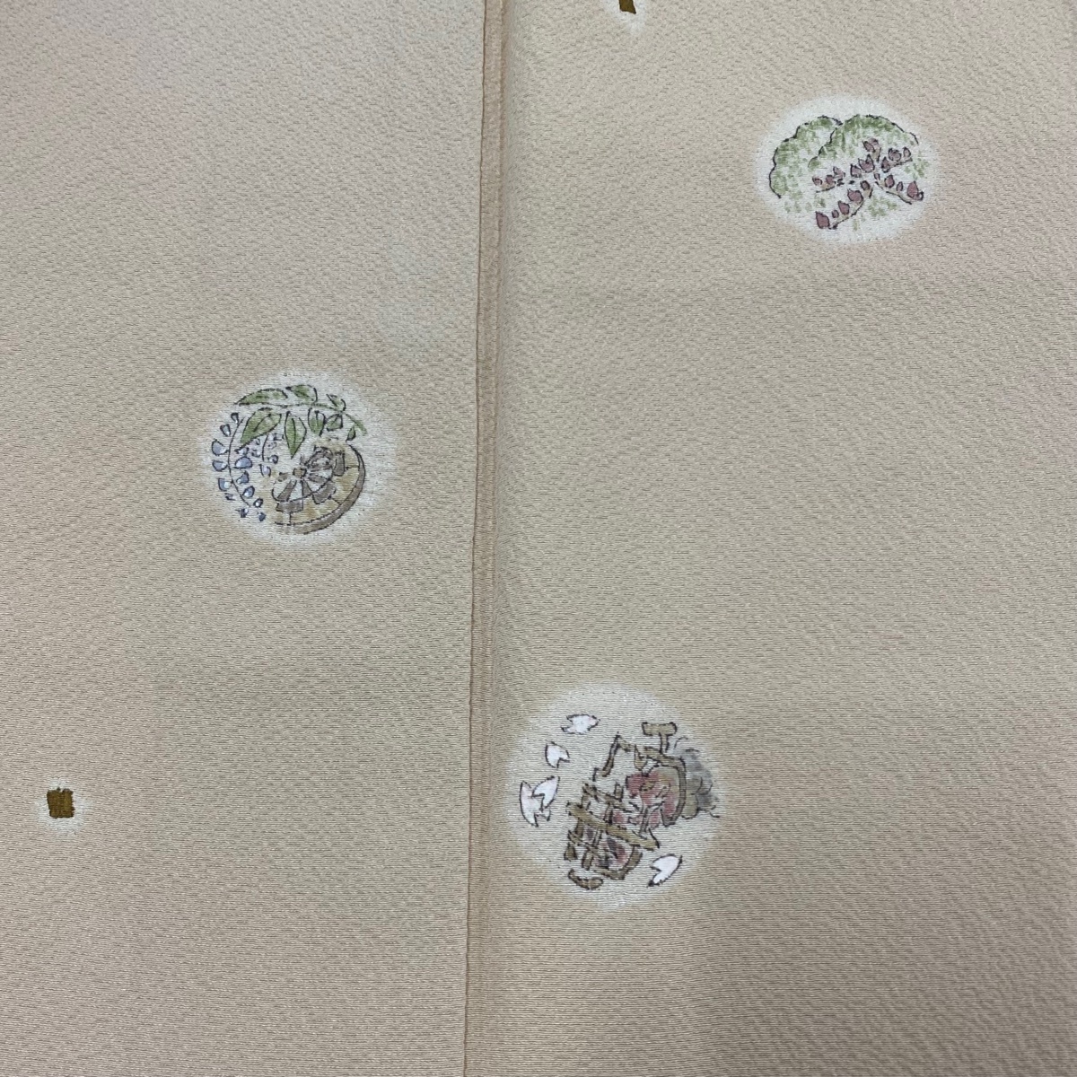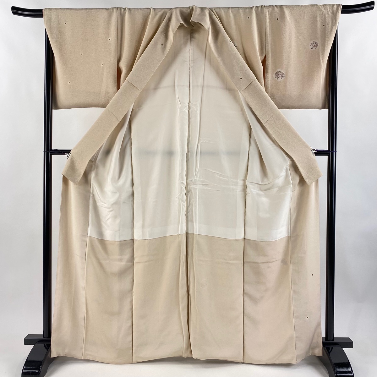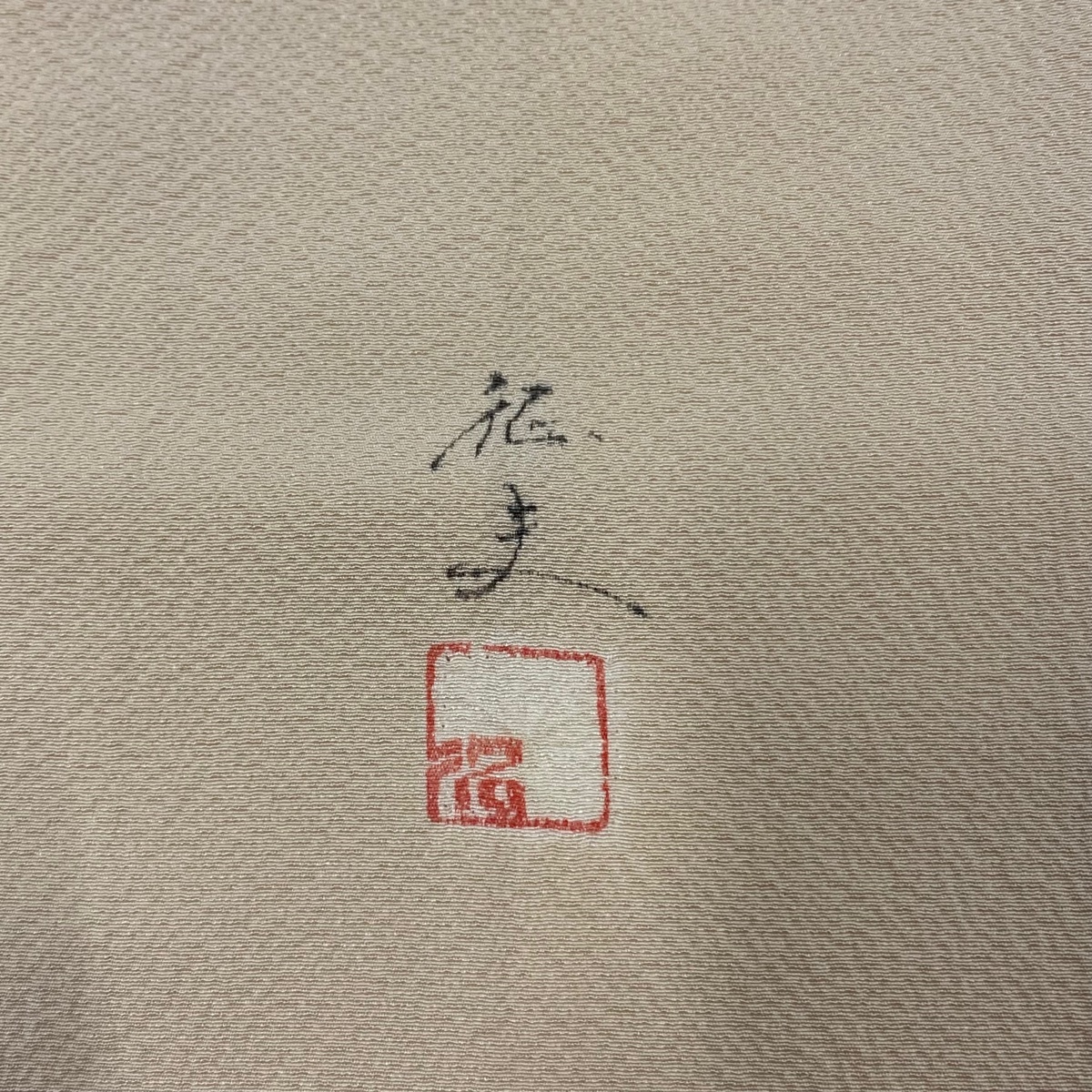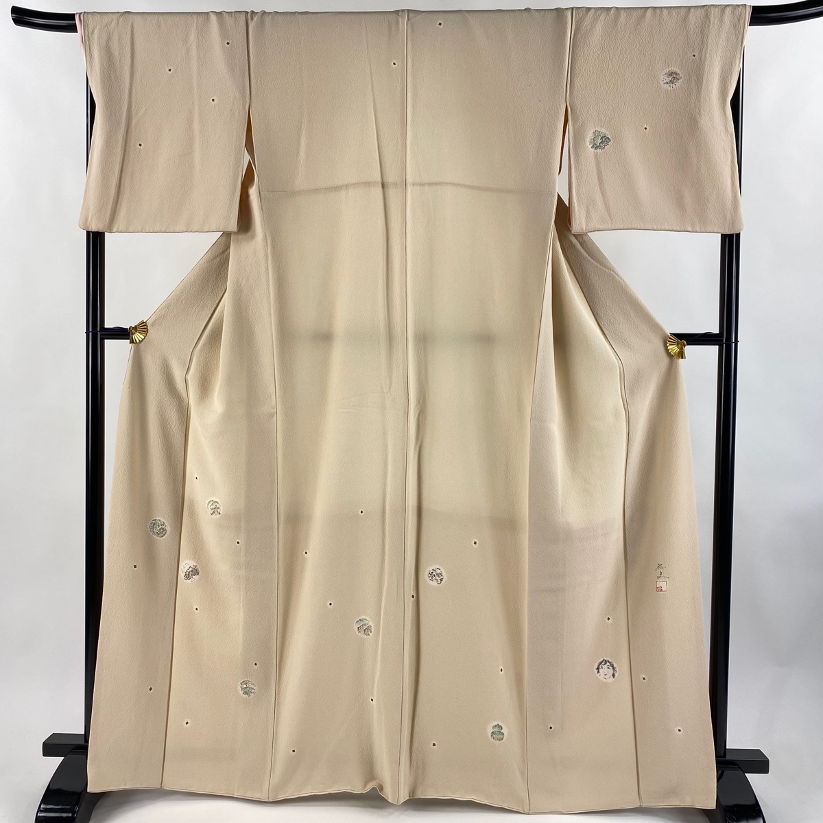 付下げ 秀品 落款 人物 草花 金彩 縮緬 ベージュ 袷 身丈164.5 裄丈67.5 L 正絹 【中古】 |