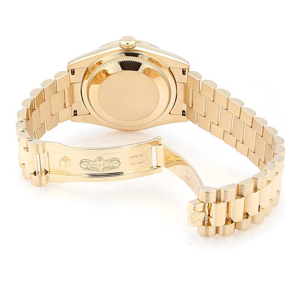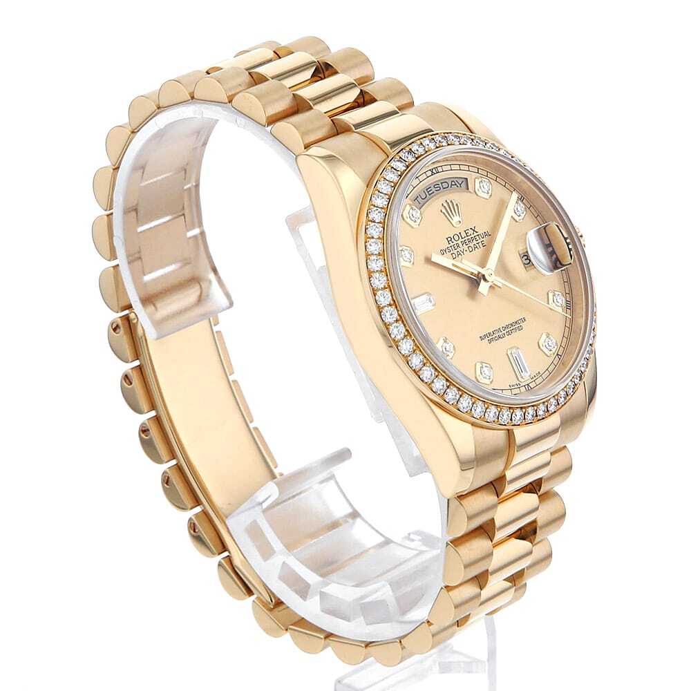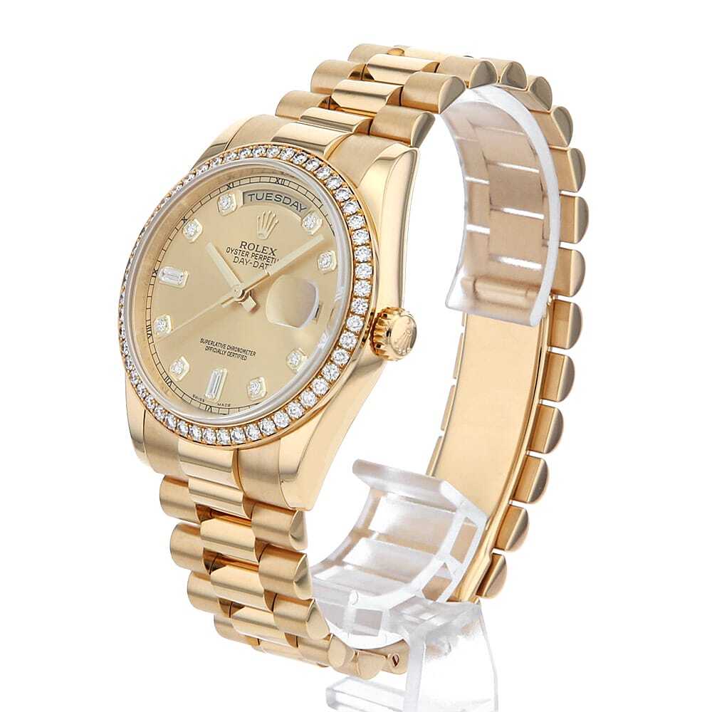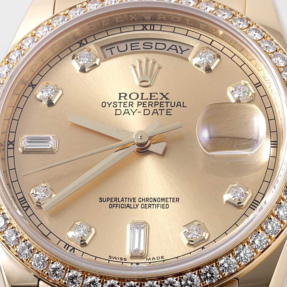 | モデル情報 | ロレックスの最上級ラインとして1956年に誕生以来、最高級の素材と質感に拘ったハイクラスシリーズデイデイト。もともとデイデイトは曜日・日付表示機能が付いたカレンダーのことを指しますが、ロレックスはこのデイデイト機能を搭載したモデルに『高級素材』のみを採用することで、成功者が持つ時計としてのステータス性を確立しました。 |