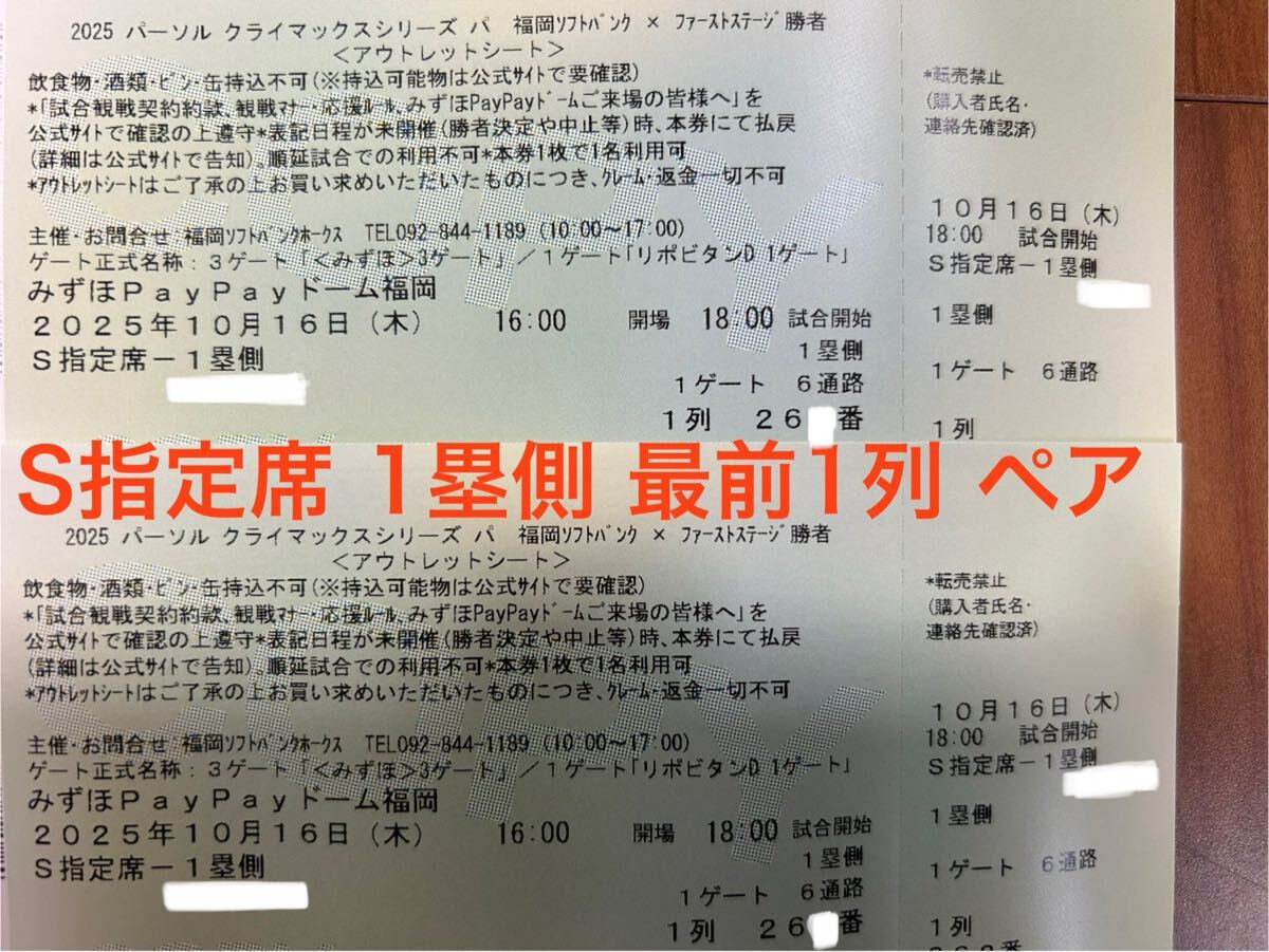 10/16 10月16日(木) 福岡ソフトバンクホークス クライマックスシリーズ ファイナルステージ S指定席 ペアチケット 1塁側 最前列1列目