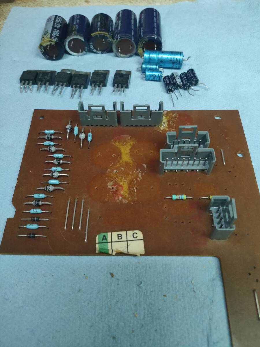 フィルムコンデンサー全て交換(コントロール基盤には正確さが求められる機器用フィルムコンデンサー使用、(アナログ基盤には今では入手困難で高価な銅箔スチールコンデンサーを使用、オペアンプはこの時代最強と説明にあるOPA1622を載せてます。画像10)、