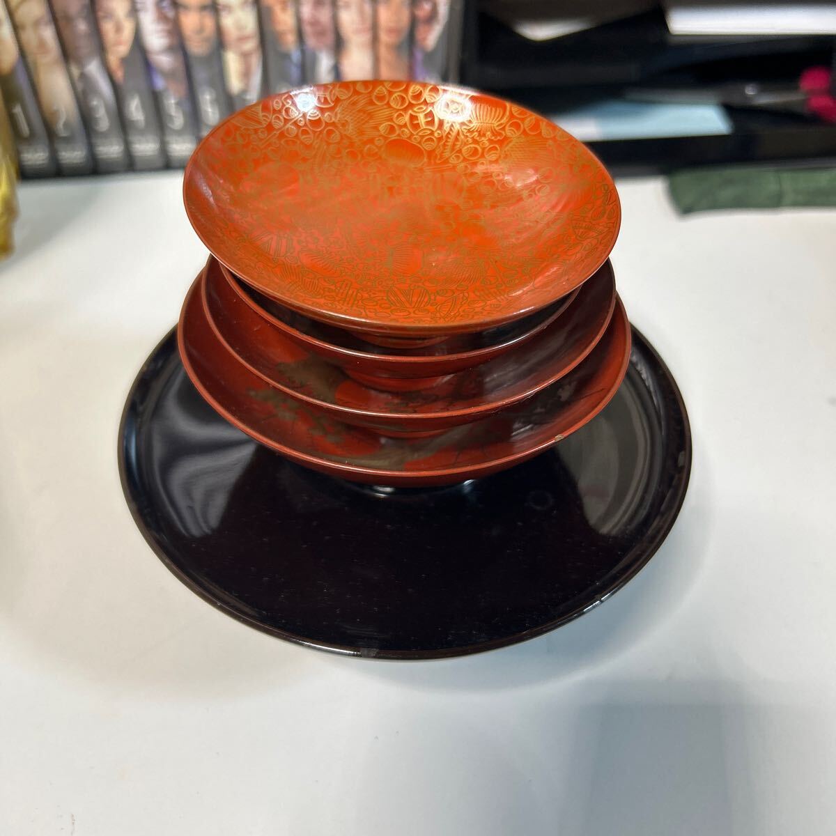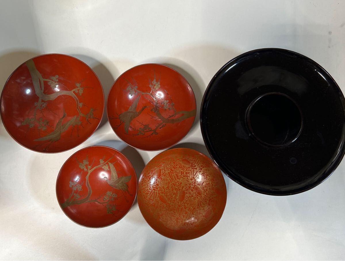 洗えば取れると思われる汚れあります。傷は写真で判断ください。盃は叩くと木製の音がします。盃置きは木製ではないように思います。