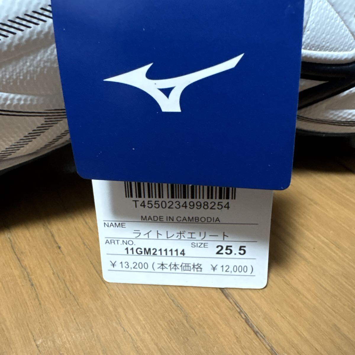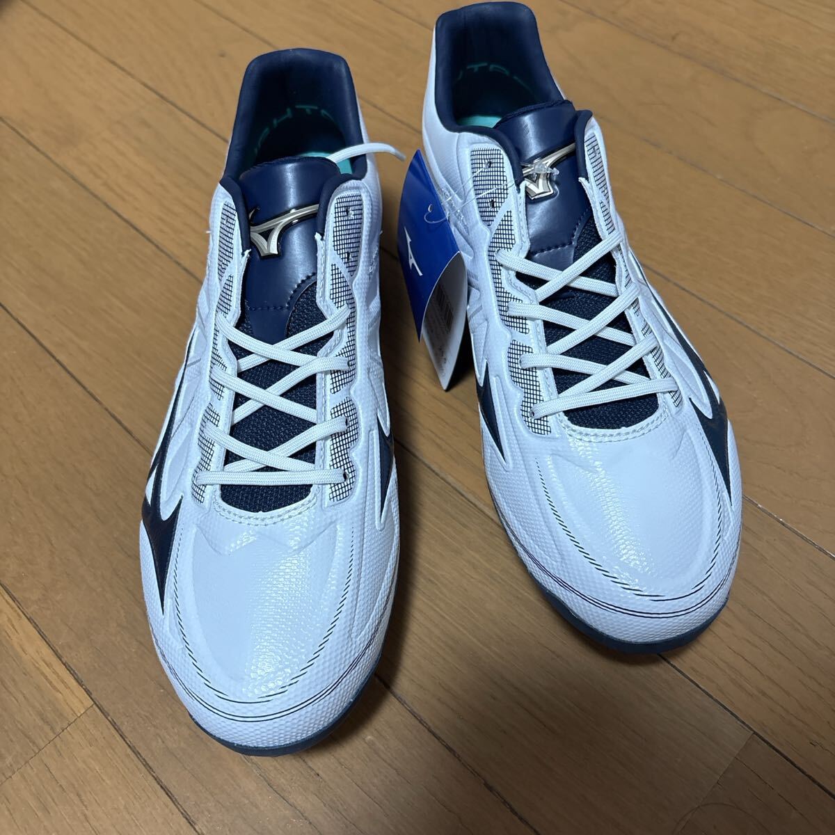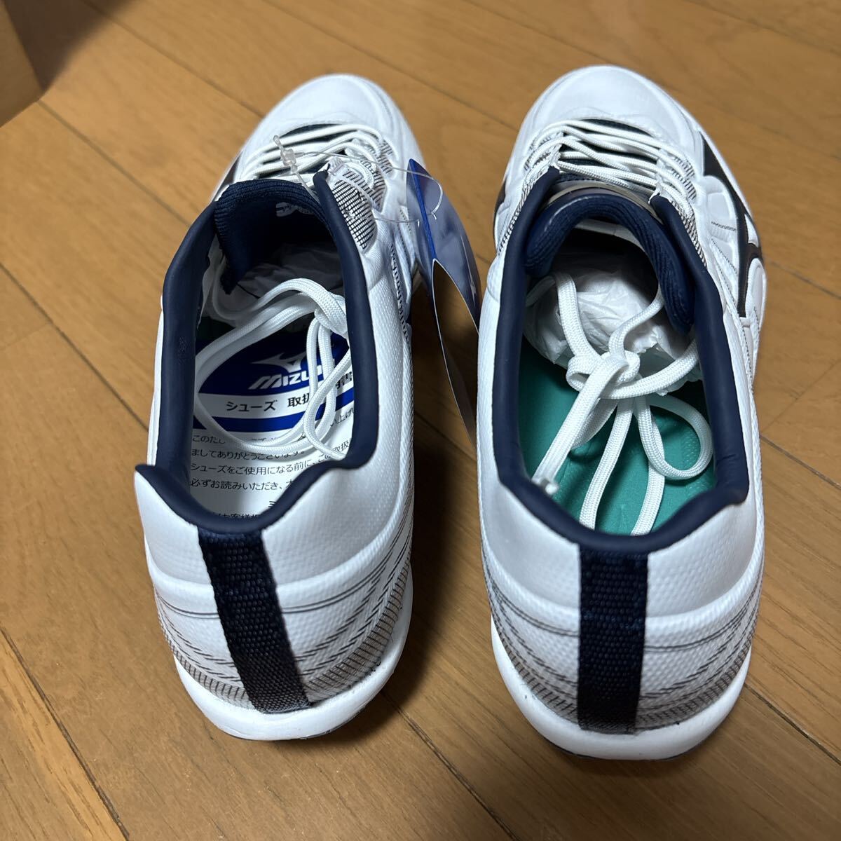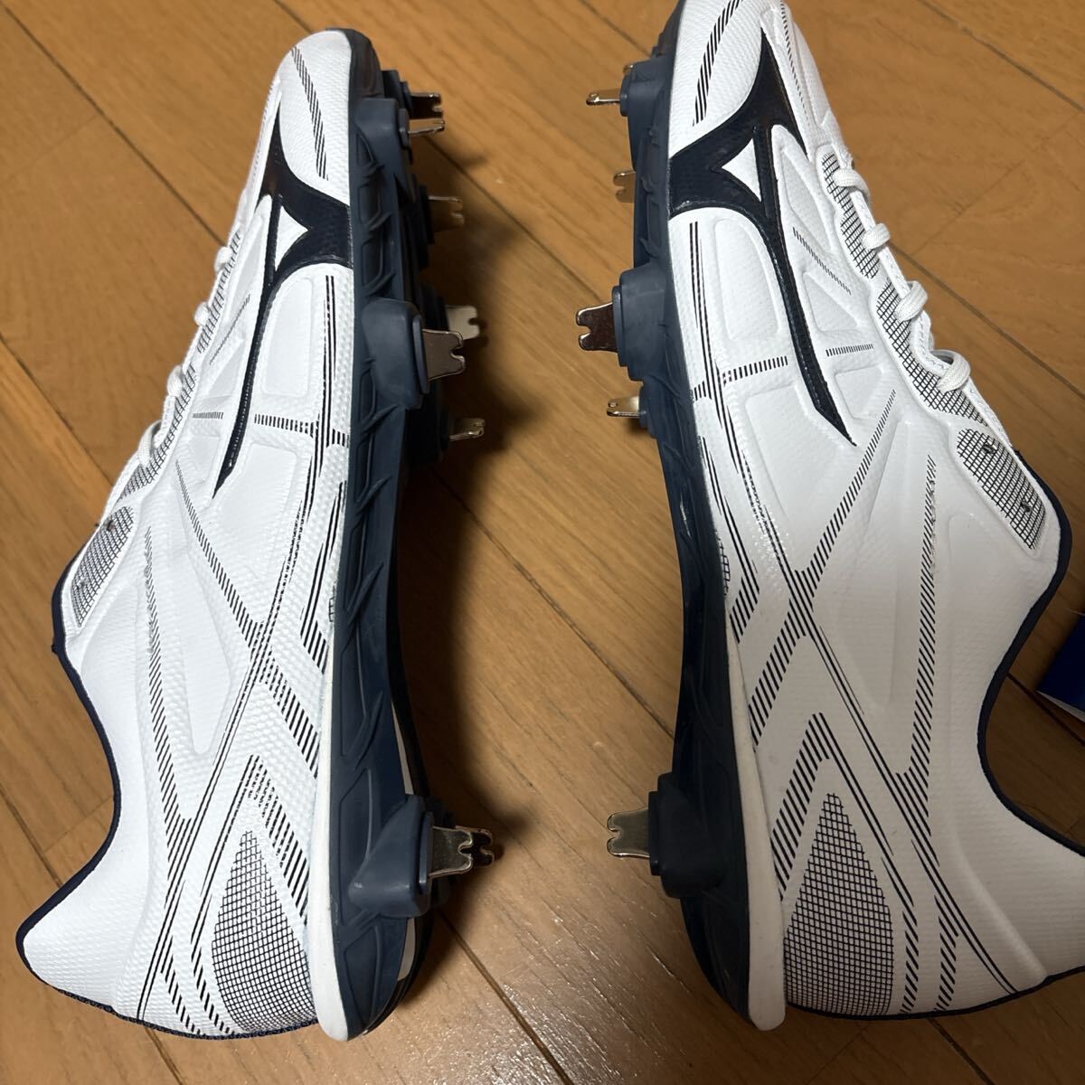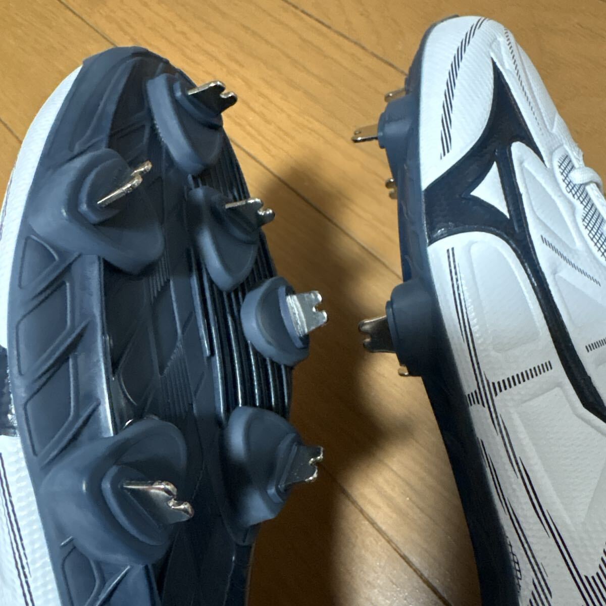 Mizunoのホワイトとネイビーのスパイクシューズ、軽量で快適な履き心地。