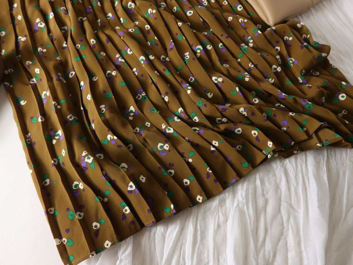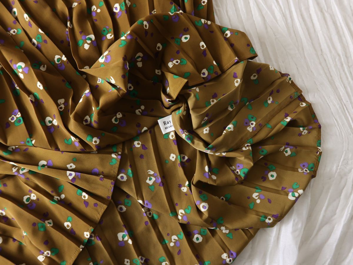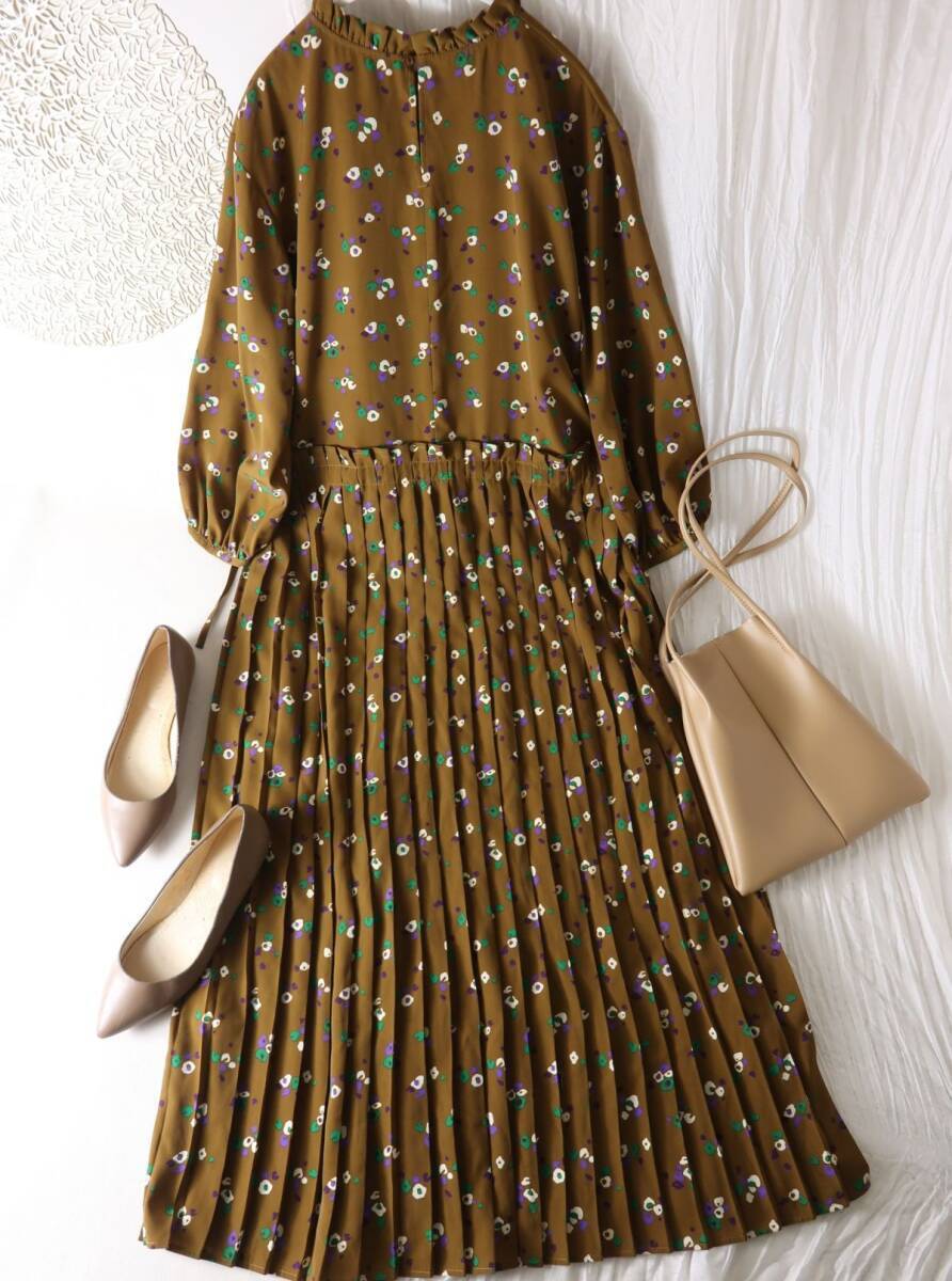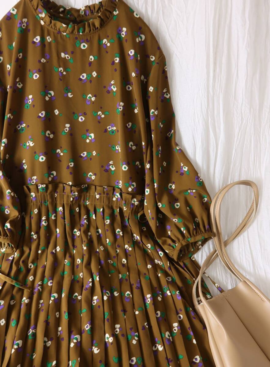 花柄×プリーツで愛らしさアップ!花柄サテン地とフェミニンなプリーツをドッキングしたワンピース。襟元と袖のボリュームはどこかレトロでクラシカルなデザインで女性らしさを演出します。主役級のアイテムなので、このまま一枚でさらりと着こなして◎