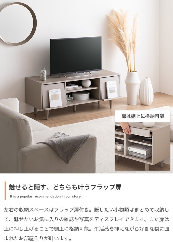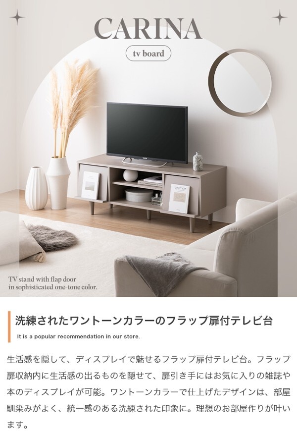 ※現在ご覧の商品ページはホワイトのご購入ページとなります。 ヤフオクの仕様上単一ページに複数バリエーションを掲載することができませんので、他バリエーションが希望の場合は別ページでご購入お願い致します。 生活感を隠して、ディスプレイで魅せる『Carina(カリーナ)』シリーズのフラップ扉付テレビ台。 フラップ扉で生活感のあるものをすっきりと隠し、扉の引き手部分にはお気に入りの雑誌や本をディスプレイできます。 統一感のあるワントーンデザインが空間に自然に溶け込み、洗練された印象に。 装飾のないノイズレスなデザインが、トレンド感溢れるホテルライクなインテリアを実現します。 配達業者を指定いただくことはできません。 沖縄・離島に関しましては、別途配送料が必要となります。 北海道への配送も別途配送料が必要になる場合がございます。 ※別途送料が発生する場合は後ほどご連絡させていただきます。 タイミングによっては在庫切れの場合があります。
