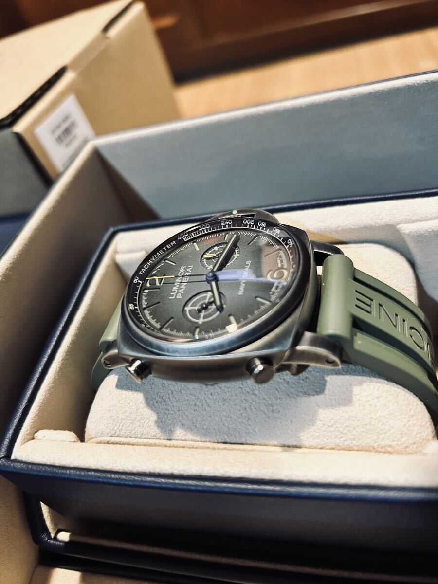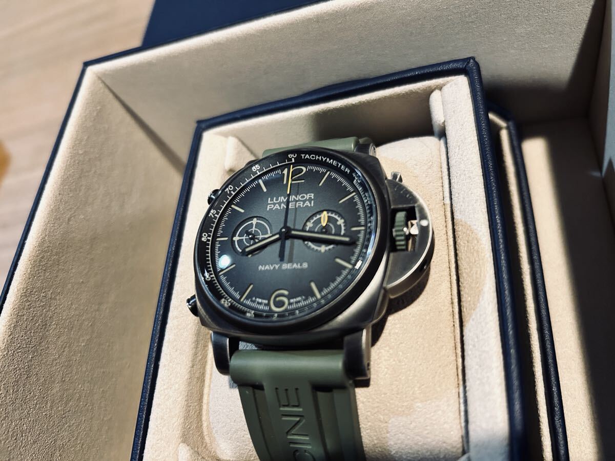 タキメーター付きのLuminor Panerai Navy Sealsモデル、ブラックとグリーンのコントラストが特徴的。