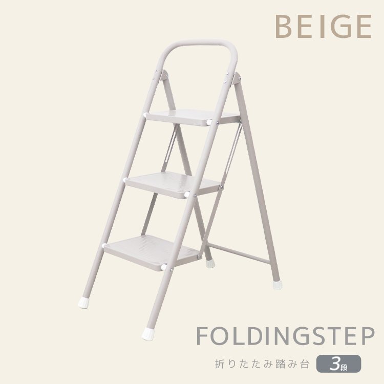 ステップ台 3段脚立 (折りたたみステップ 滑り止め加工) 耐荷重(約): 150kg 段数: 3段タイプ カラー: ベージュ 暮らしに馴染むやさしいカラーの折りたたみステップです。 一家に一台あると便利! 照明器具の交換や、高い位置になる棚から物を取り出すときに便利!! 耐荷重(約)150kg&ワイドステップ!安定感抜群で安心♪ また、滑り止め加工・握りやすい持ち手・脚先グリップで最上段まで簡単に上れます! お部屋や玄関に置いても邪魔にならないスリムサイズ。 折りたためばコンパクトに!手軽に持ち運びできちゃいます☆ |