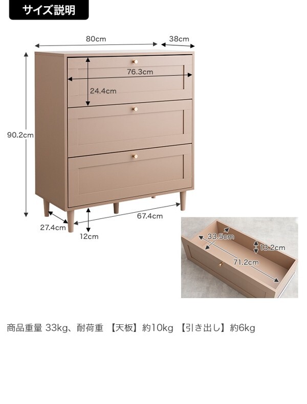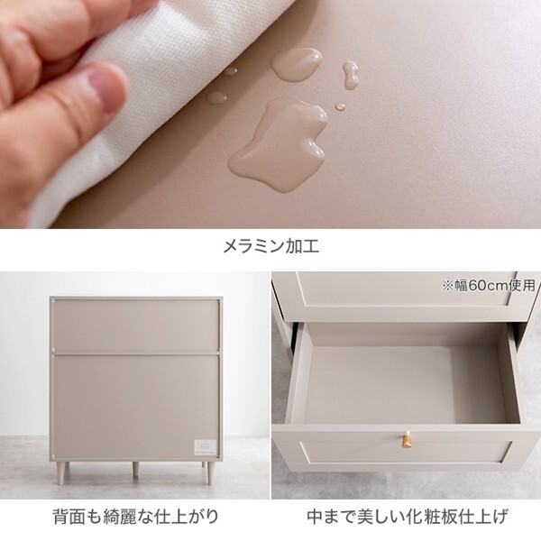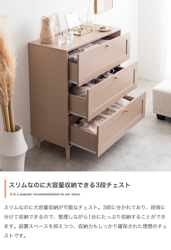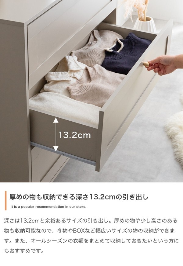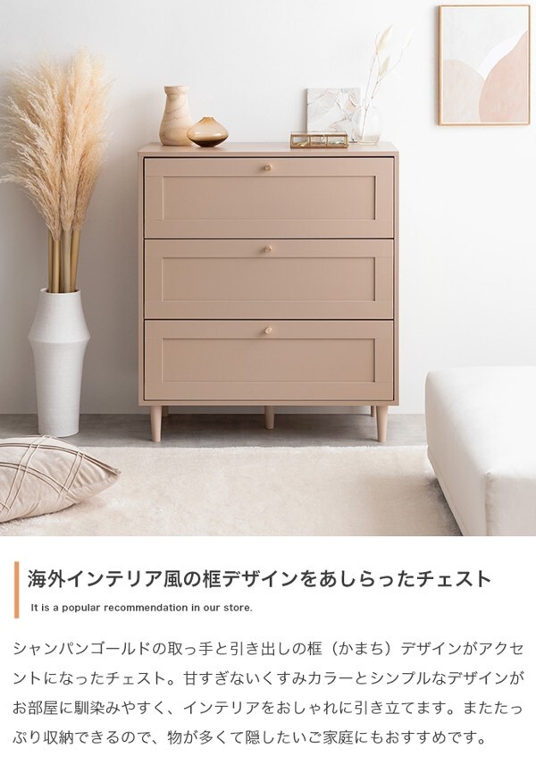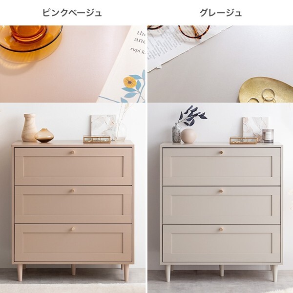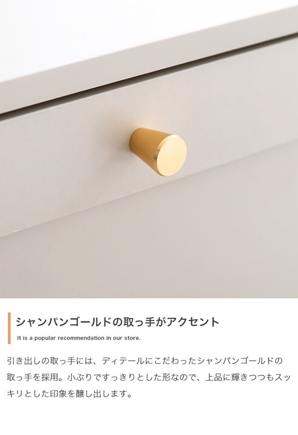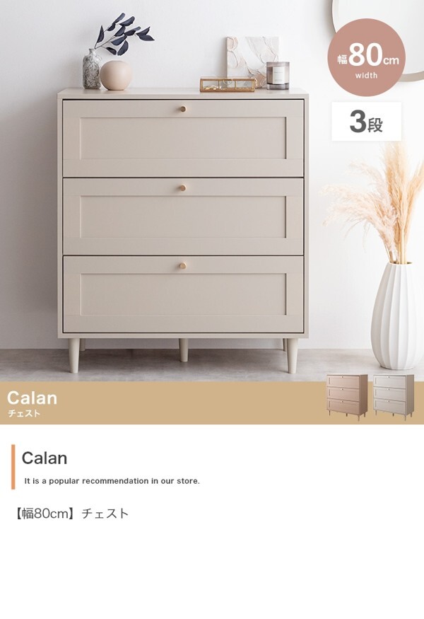 ※現在ご覧の商品ページはグレージュのご購入ページとなります。 ヤフオクの仕様上単一ページに複数バリエーションを掲載することができませんので、他バリエーションが希望の場合は別ページでご購入お願い致します。 品のある框デザインと柔らかなニュアンスカラーが印象的な『Calan』シリーズのチェスト。 シャンパンゴールドの取っ手と美しい框デザインがお部屋のアクセントとなり、感度の高い海外インテリアのような空間へと導きます。 柔らかなニュアンスカラーで甘すぎない大人な可愛さもプラスし置くだけでお部屋をセンスアップさせます。 また収納力も抜群で引き出しの深さもしっかりあるので、厚手の物や高さのある物もしっかり収納できます。 オールシーズンの衣類をまとめて収納しておきたい方にもオススメです。 配達業者を指定いただくことはできません。 沖縄・離島に関しましては、別途配送料が必要となります。 北海道への配送も別途配送料が必要になる場合がございます。 ※別途送料が発生する場合は後ほどご連絡させていただきます。 タイミングによっては在庫切れの場合があります。