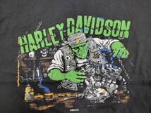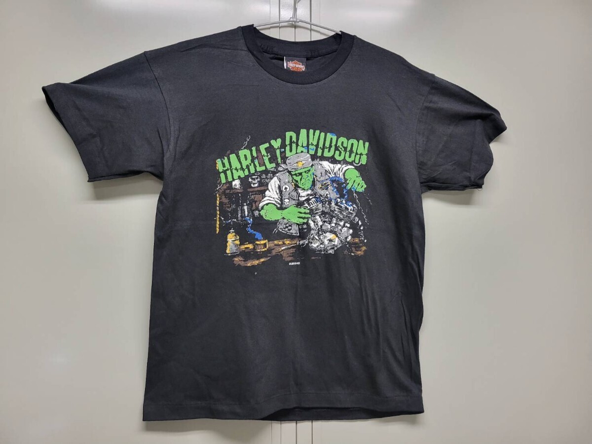 系のバイカーTシャツ。フロントにはフランケンシュタイン風メカニックがVツインエンジンを整備中というユニークなアート。バックにはNEW YORK州ウッドストックのハーレーディーラー名とピースマークを大胆にプリント。両面とも色使いが派手で映えるデザイン。VF imagewear製のUSAボディ使用。