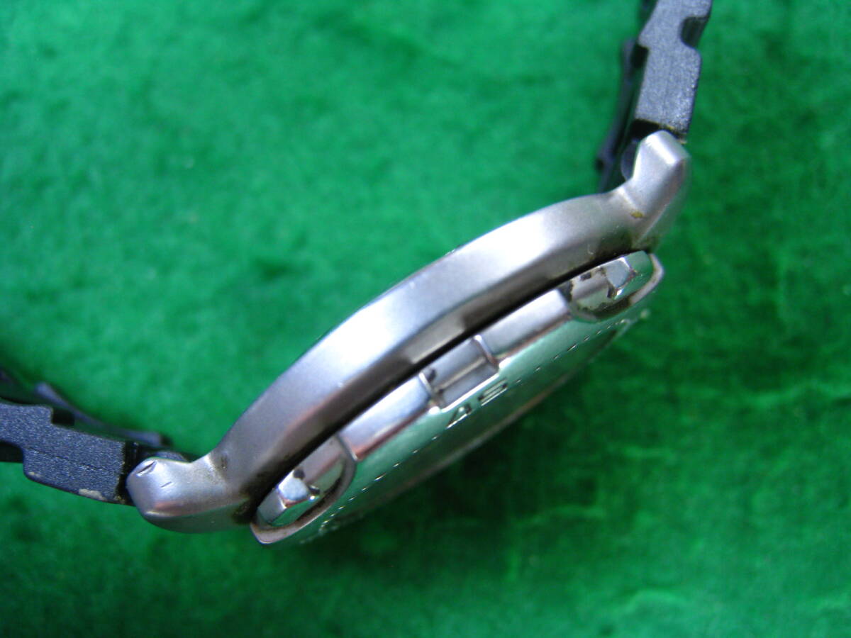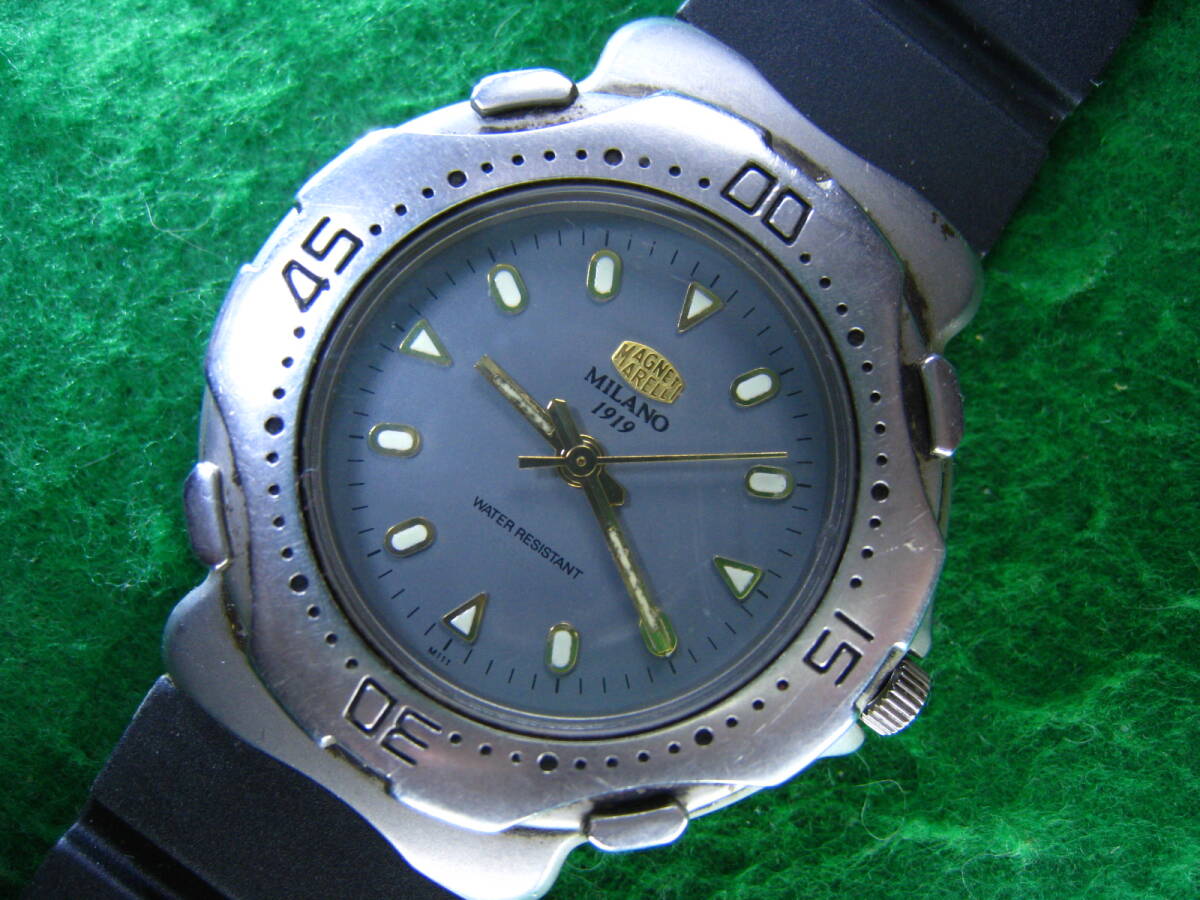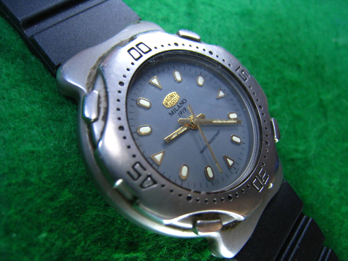 美品レア MAGNET MARELLI MILANO メンズQZ ダイバー 10bar 回転ベゼルブルーグレイ文字盤です。古い時計ですがいい状態だと思います。ブルーグレイの文字盤に金色三針、インデックスも金色です。風防は経年使用での小キズ小スレは見られますが視認性はPHOTOのように悪くないと思います。逆回転防止ベゼルとケースは目に付くキズやイタミは見られません。スク竜バックは開閉時のキズがあります。ベルトは今回新品のブラックラバーを取り付けています。アウトドアにも4ビジネスにも使えそうなカッコイイ時計だと思います。