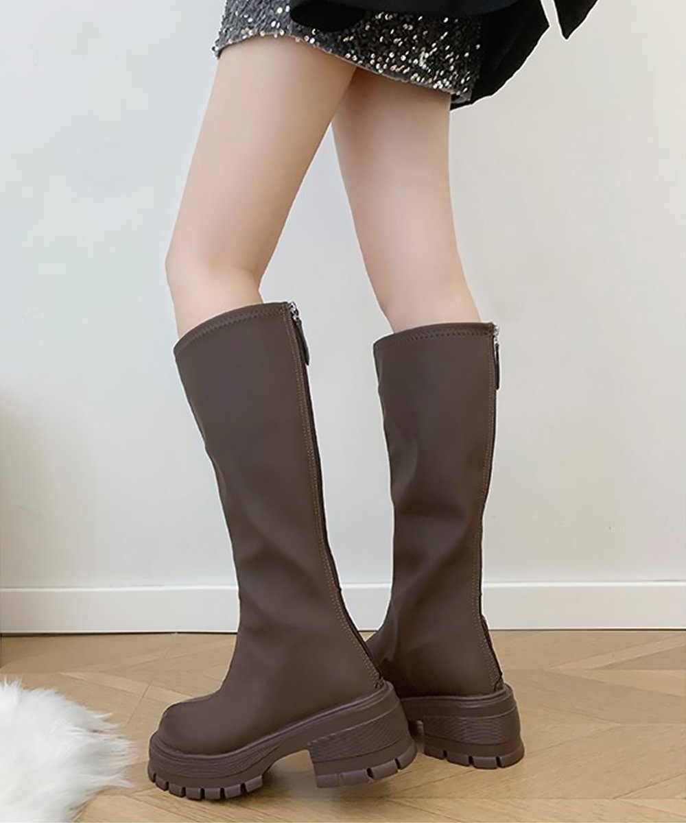 レディースブーツ チャンキーヒール 秋冬 膝下 おしゃれ バックジップ 歩きやすい カジュアル 美脚脚長ブーツ 人気くつ