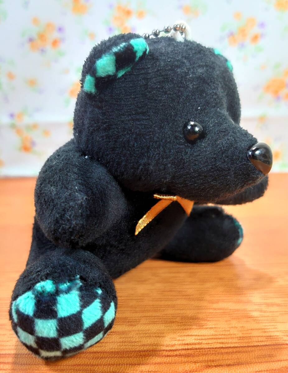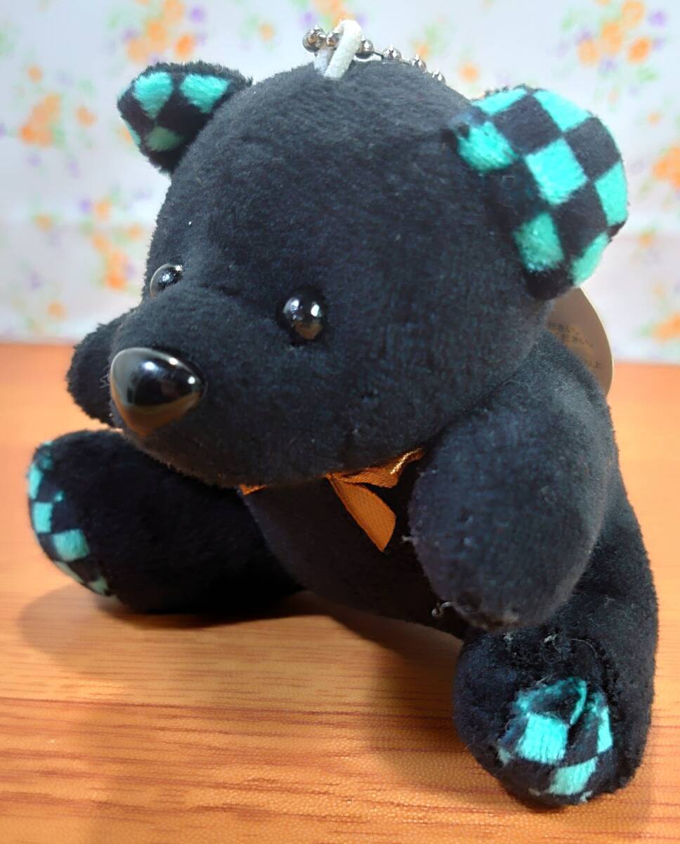 [ぬいぐるみストラップ]アニマルキーチェーン 熊ブラック 緑黒チェック 市松模様