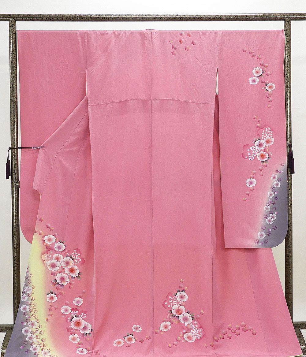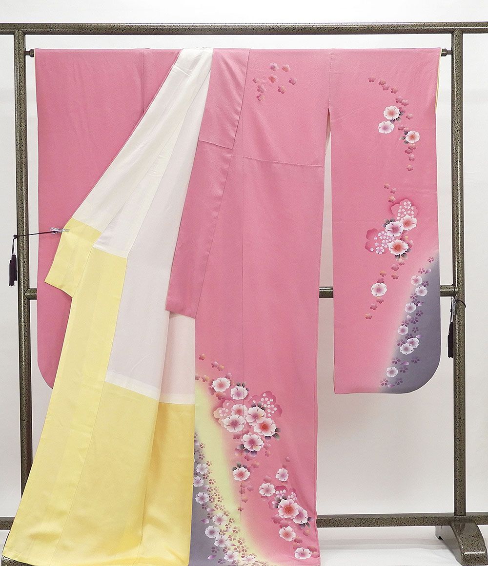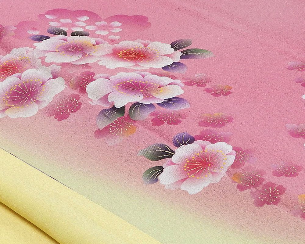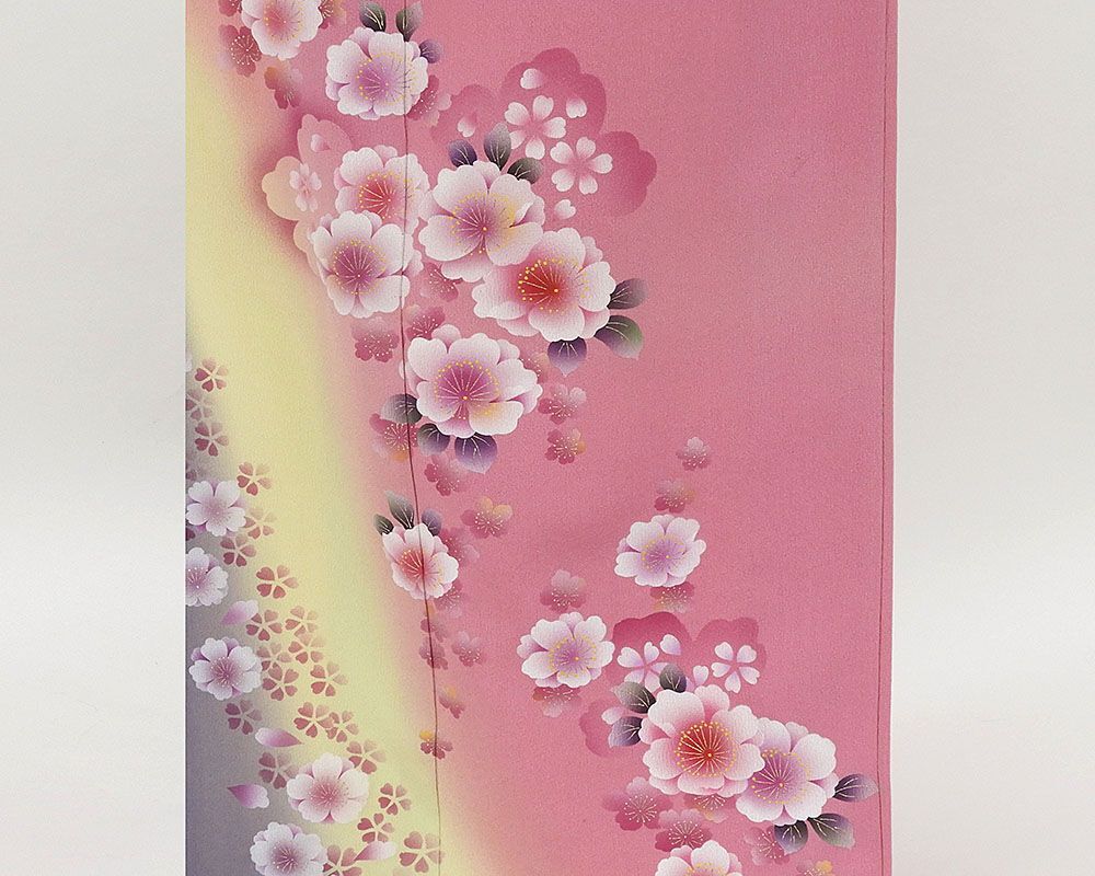 フューシャピンク地に若苗色と鳩羽鼠色の裾ぼかしと多色箔や金箔で桜模様が柄付けされています。
