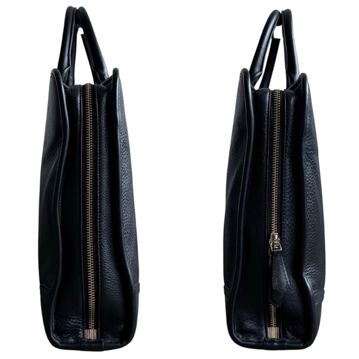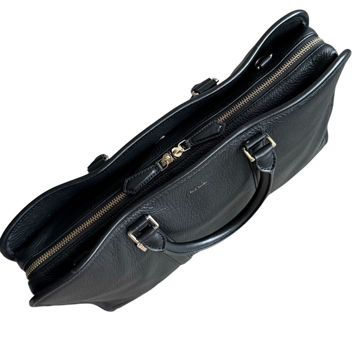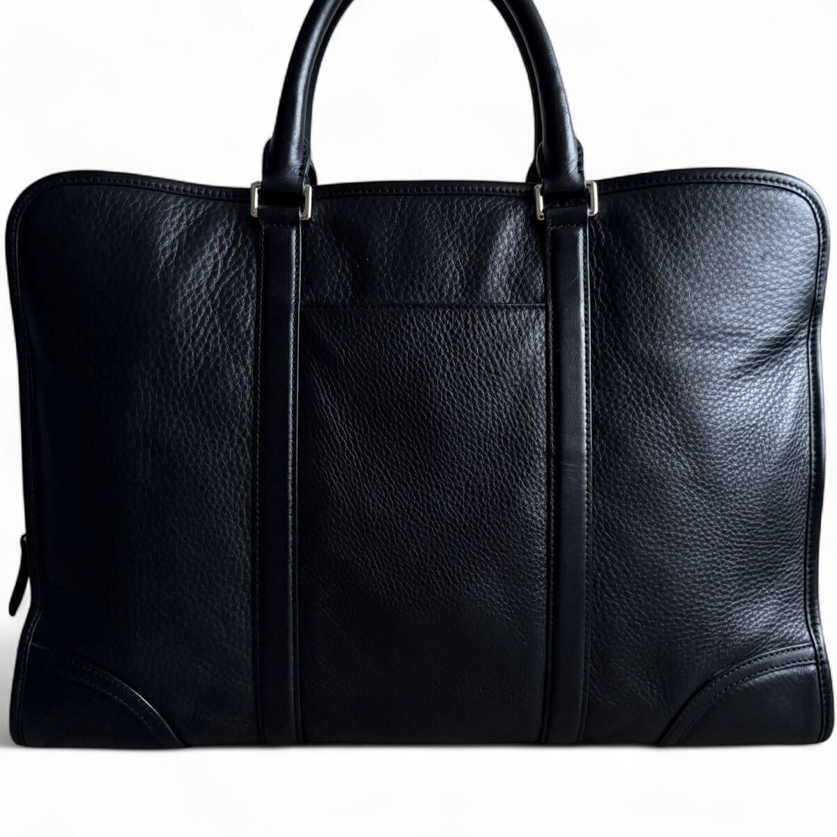 こちらはシボ感のある上質な本革のレザーを贅沢に使用した近年モデルのビジネスバッグ。落ち着きと重厚感を放つブラックレザーに、さりげなく輝くゴールド金具がアクセントとなり、洗練された大人の風格を漂わせます。フロントにはブランドロゴとマルチストライプのアイコンが施され、シンプルでありながらも確かな存在感を放つ仕上がりです。