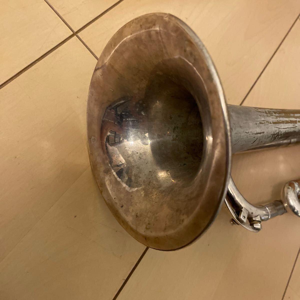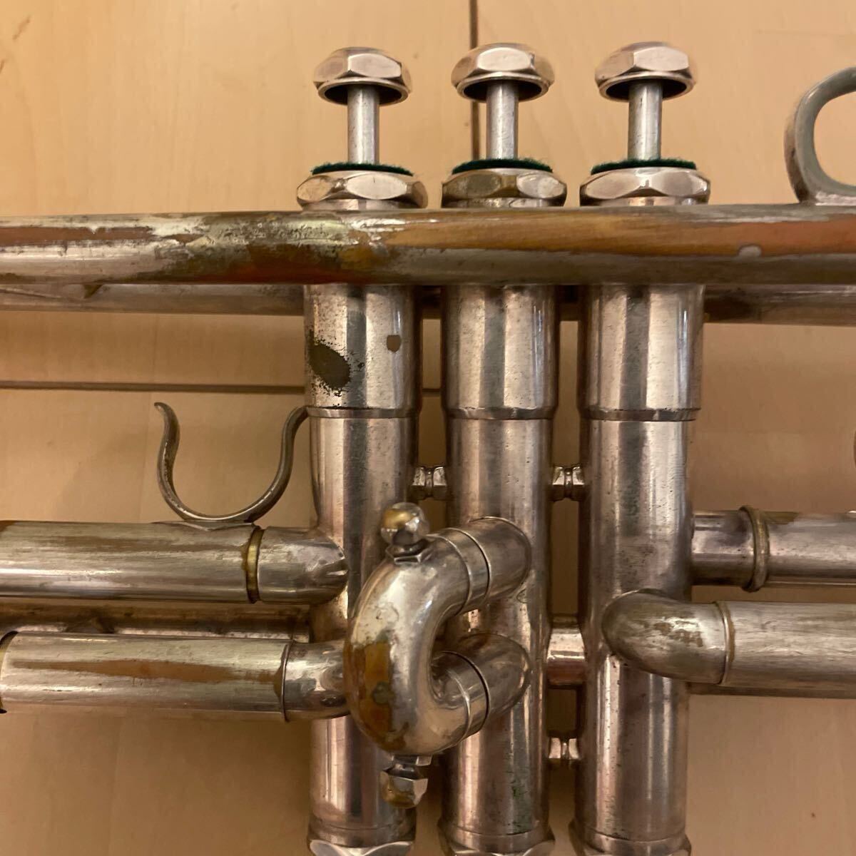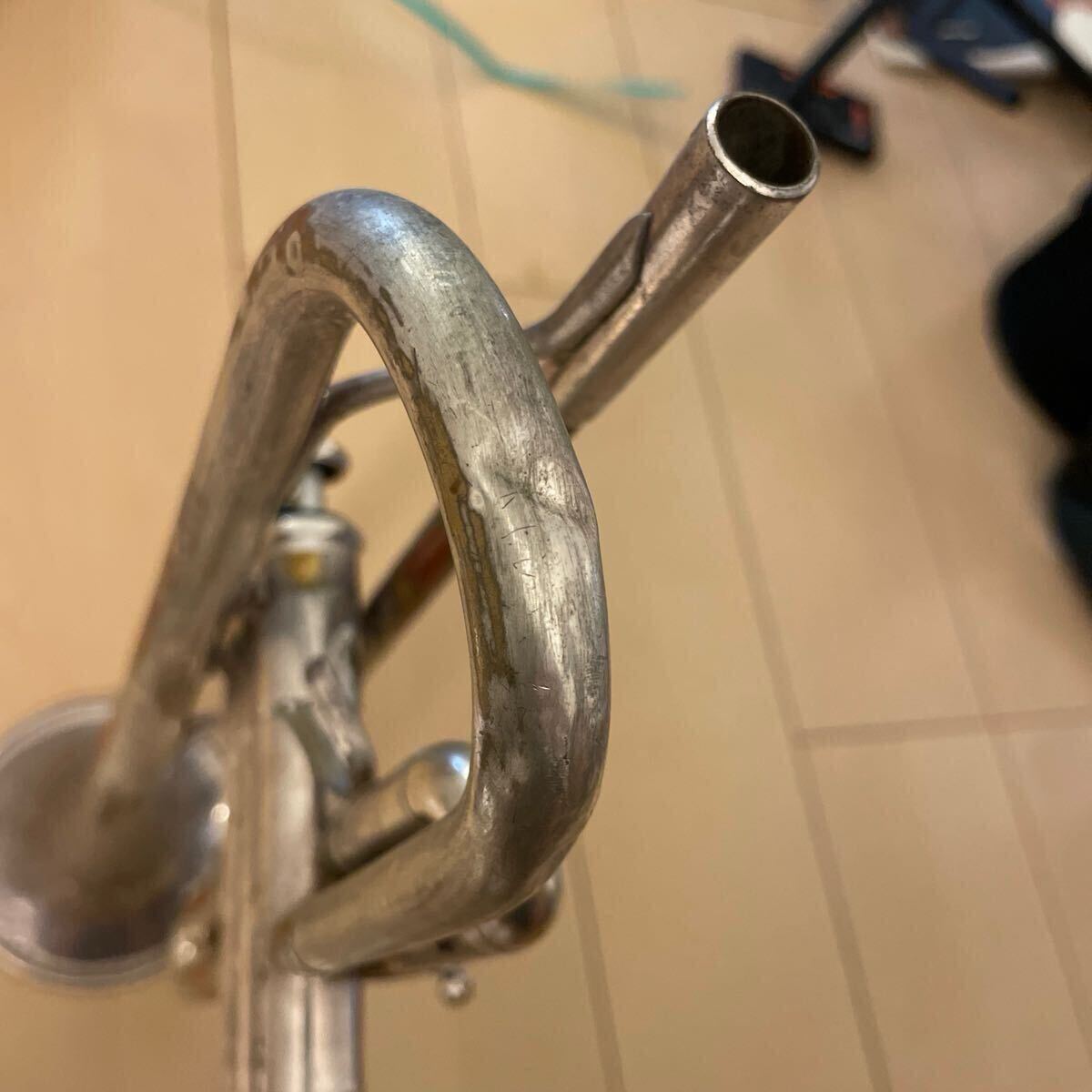 メッキの状態はご覧の通りで凹みあります(主にベルとU字部分)。稼働部は全部抜け、ピストンもスムースです。古い楽器ですが鳴りは流石のシルキーです。