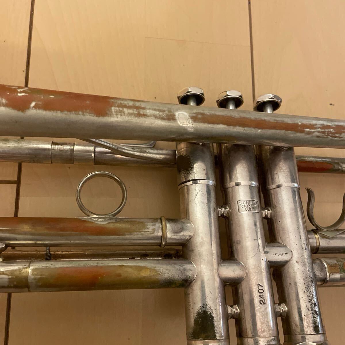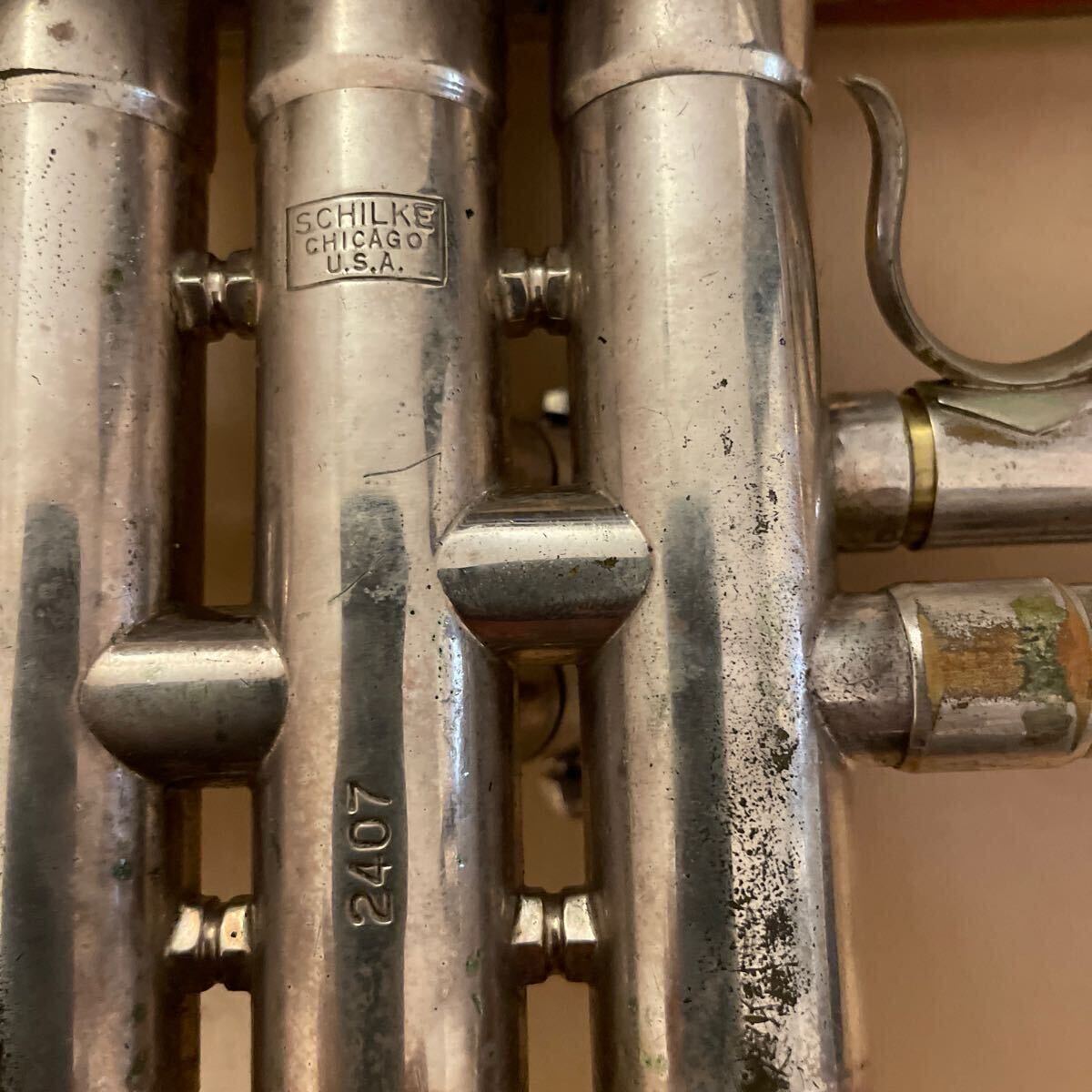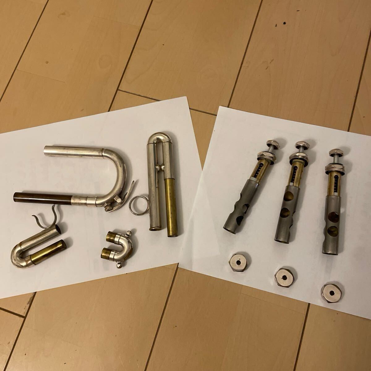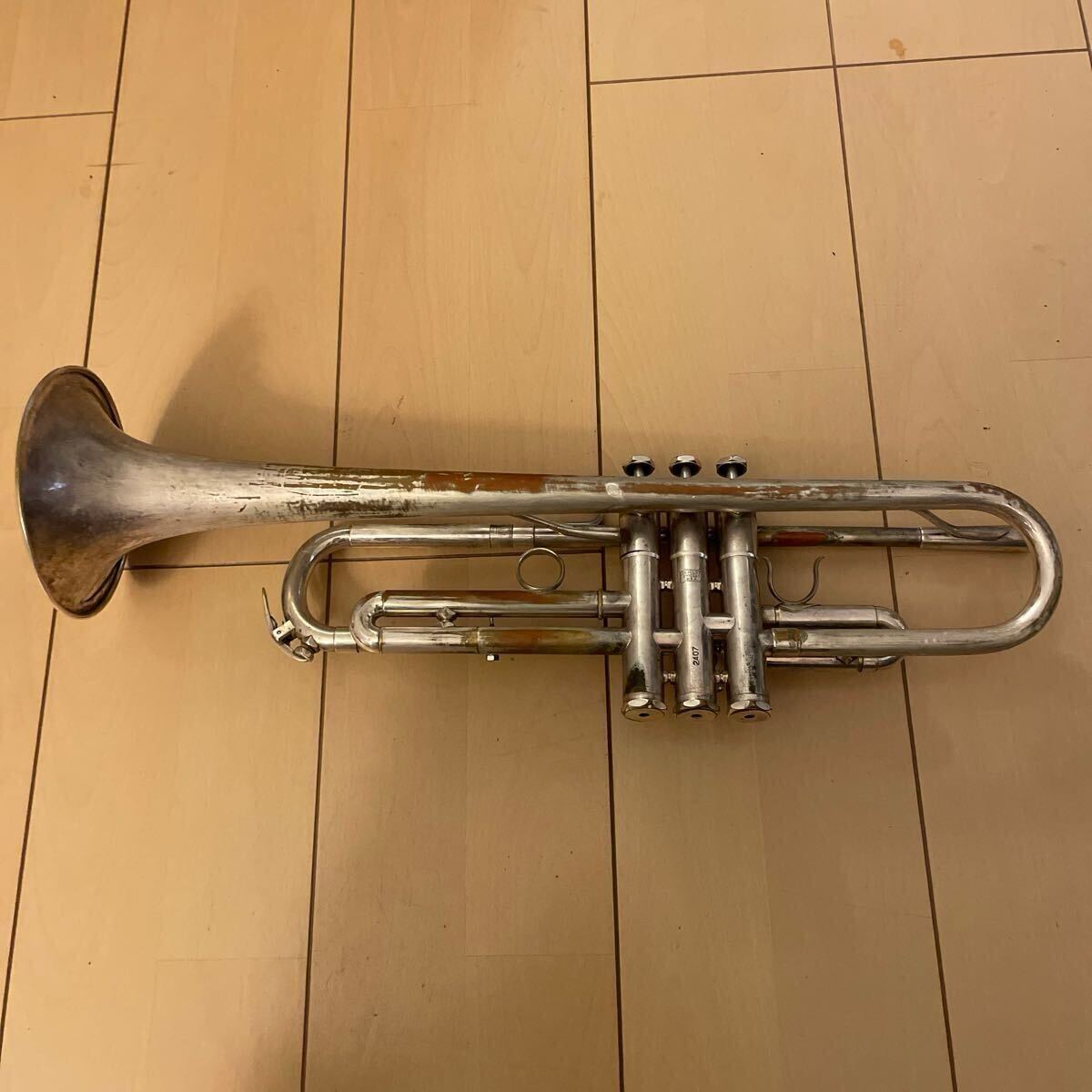 メッキの状態はご覧の通りで凹みあります(主にベルとU字部分)。稼働部は全部抜け、ピストンもスムースです。古い楽器ですが鳴りは流石のシルキーです。