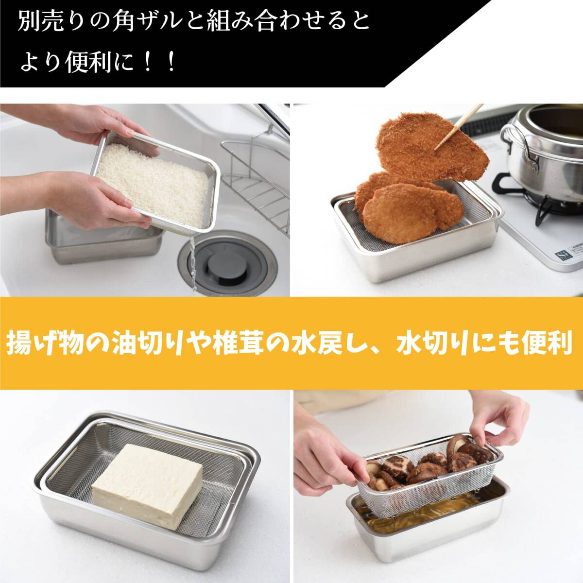 ・【シリーズ品で揃えて便利!】「お料理はかどる」シリーズの角バット・ザル・トレーを一緒に使えばさらに便利!米研ぎ、湯切り、水切り、乾物の水戻し、貝の砂抜きなど、様々な場面で活躍します。