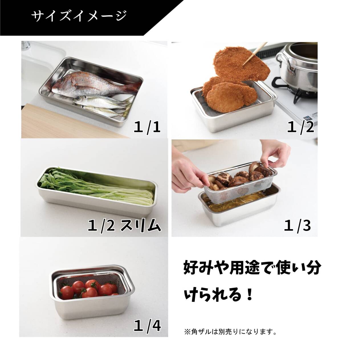 アーネスト「お料理はかどるシリーズ 角バット」【省スペース設計】深型・角型だから、円形タイプと比べ、同じ量の食材を入れても省スペースで使うことができ、調理台がすっきりします。【調理中も調理後も使いやすい】角型だから、複数使った場合重ねて置くことができ、場所をとりません。また、調理後は重ねてコンパクトに収納することができます。【便利なフタ付き】フタ付きなので、使いきれなかった食材はそのまま冷蔵庫に保管できます。また、冷蔵庫で下ごしらえをする調理の際も便利です。中身が確認しやすい透明タイプ。【シリーズ品で揃えて便利! 】「お料理はかどる」シリーズの角バット・ザル・トレーを一緒に使えばさらに便利! 米研ぎ、湯切り、水切り、乾物の水戻し、貝の砂抜きなど、様々な場面で活躍します。●本体サイズ:幅33×奥行22×高さ5.5cm●フタ着用時:幅33.5×奥行22.5×高さ6cm●材質:角バット/18-8ステンレス、蓋/ポリエチレン(耐熱温度60℃、耐冷温度ー20℃)●お手入れ:バット/食洗機対応、フタ/手洗い●原産国:日本(燕三条)