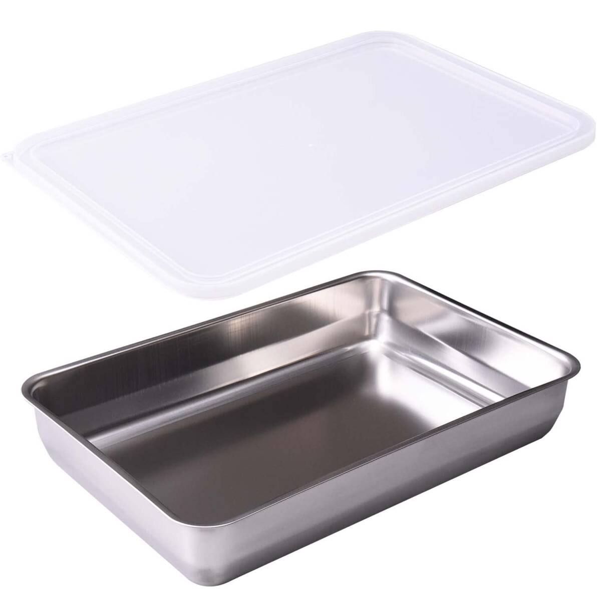 ・●本体サイズ:幅33×奥行22×高さ5.5cm●フタ着用時:幅33.5×奥行22.5×高さ6cm●材質:角バット/18-8ステンレス、蓋/ポリエチレン(耐熱温度60℃、耐冷温度ー20℃)●お手入れ:バット/食洗機対応、フタ/手洗