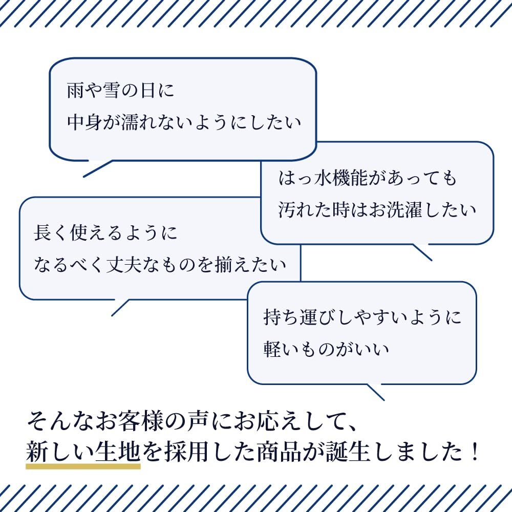 ・軽くて丈夫、そして水を弾くはっ水機能!快適さを追求した新素材は、耐久性のある軽い素材なので、毎日の使用にも最適です。水や液体が表面に弾いて滑り落ちるはっ水機能は、汚れに強く、水に濡れてもサッとひと拭き、お手入れ簡単です。