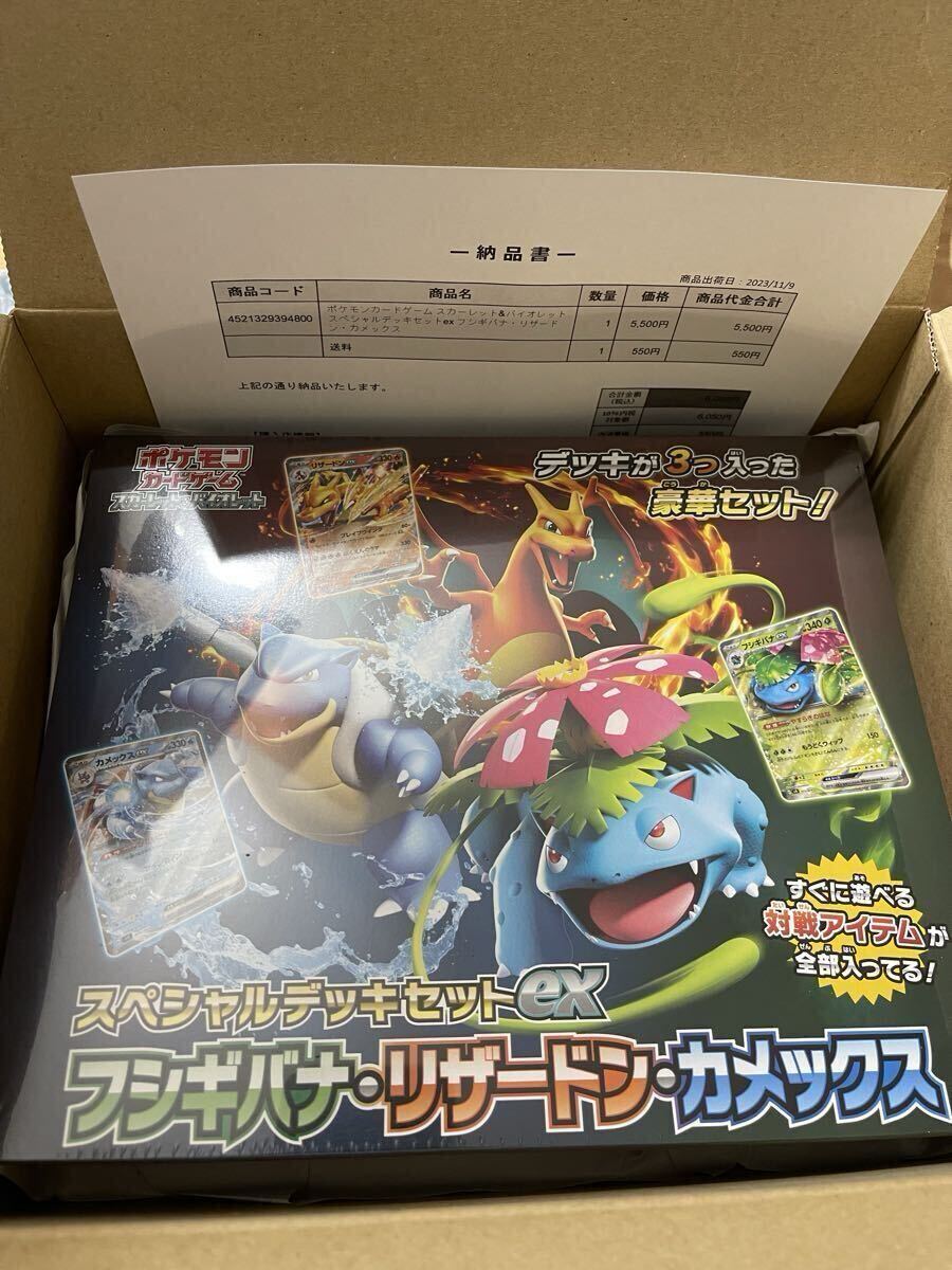 ポケモンカードゲーム スカーレット&バイオレット スペシャルデッキセットex フシギバナ・リザードン・カメックスです。 デッキが3つ入った豪華セットで、すぐに遊べる対戦アイテムが全て揃っています。