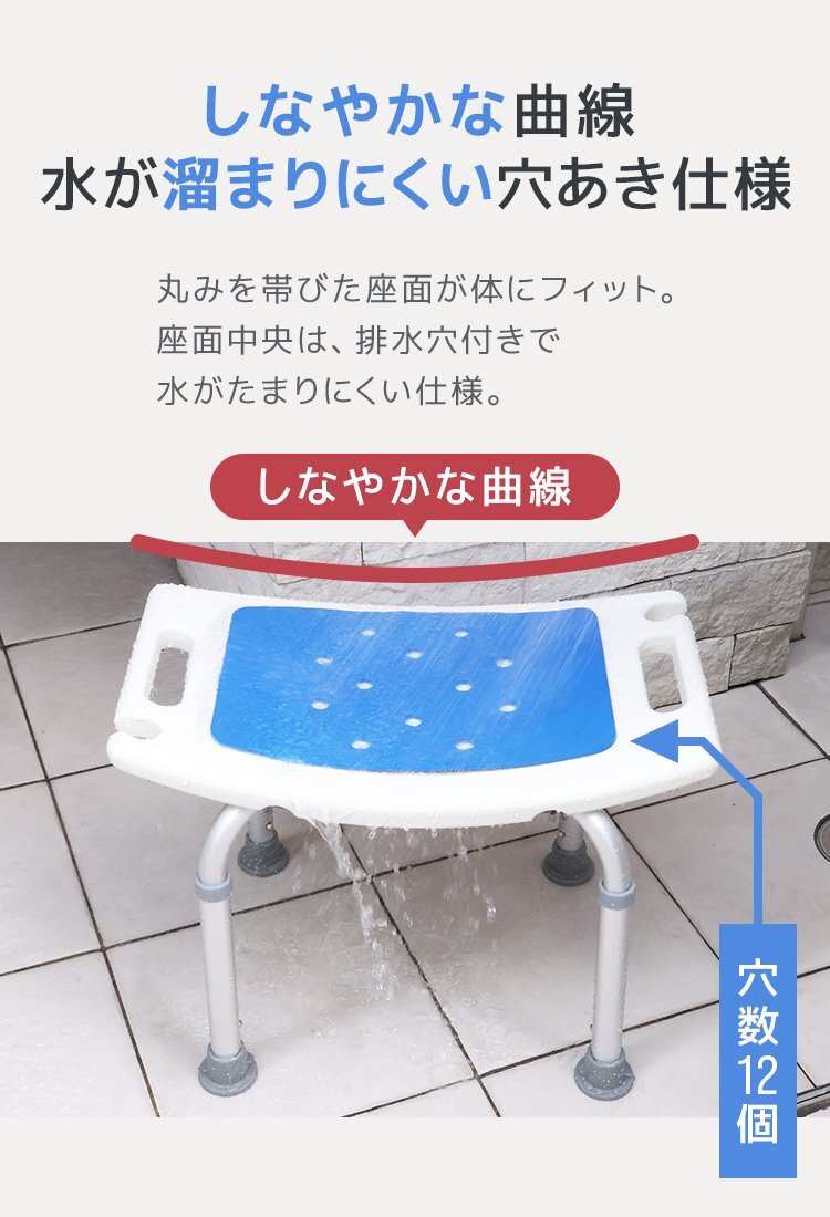 \ 8段階調節可能な座面 / 膝や腰の負担を軽減!シャワーチェアです。 身体に合わせて8段階の高さ調節ができ、立ち上がる際の膝と腰の負担を軽減できます。 ボタンを押しながらスライドさせて簡単にお好みの高さに変更可能! シャワーチェアの脚の先は滑りにくいゴム製になっているので転倒防止になります。 座面に排水穴があり、水がたまらないので清潔! クッションマット付きでひんやりを解消! フレームは丈夫なアルミ製で、丸みを帯びた曲線が身体にフィット感をもたらします! 座面部は、滑り止め加工が施され、安心して使用いただけます。 立ち上がり用の取って付き!立ち座りの際に便利です。 軽量なので、移動するときもラクラクです。 ■商品コード:HBC002BL ■商品仕様 カラー:ブルー サイズ:(約)幅51.5cm×奥行36cm×高さ39.5~57cm(全体) 重量:(約)1.9kg 耐荷重:(約)150kg 素材:アルミニウム、ポリエチレン 他 ■注意事項 ・座面の上に立ったり、脚をかけたり、飛び乗ったりしないでください。 ・直射日光またはストーブ等の熱は避けてご使用ください。 ・本製品を改造、分解しないでください。 ・本製品を用途以外で使用しないでください。 ・使用中にガタつきなどがみられる際は、ネジを締め直してください。 ・商品は、モニターによって色合いが異なって見える場合があります。 ・仕様・デザインは改良のため予告なく変更することがあります。 ■保証期間 7日間 ※商品到着後7日以内の初期不良・破損のみご対応させていただきます。 【新品未使用品です】 |