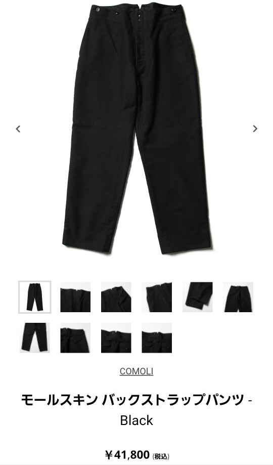 ブランド:即完売 comoli モールスキン バックストラップ パンツ 《コモリ》BLACK