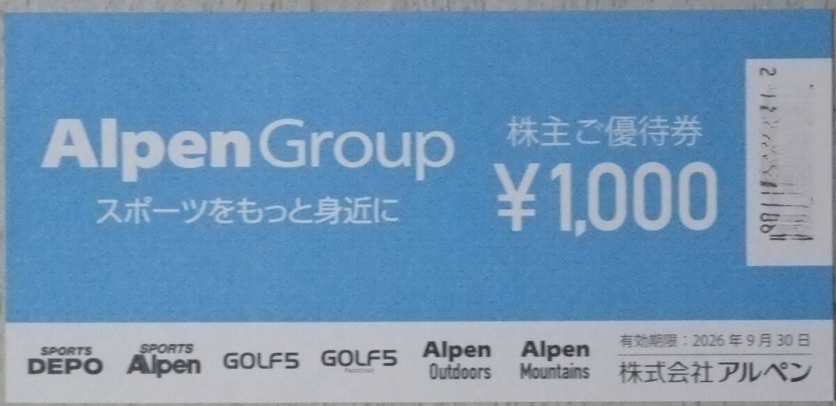 アルペン株主優待券1000円分 alpen 期限2026年9月30日