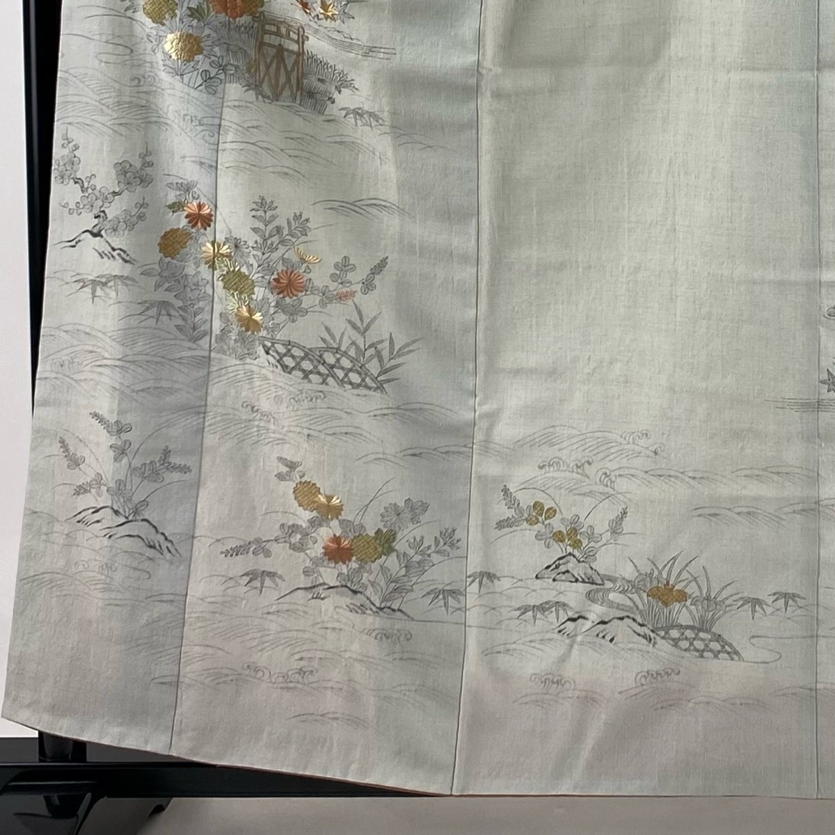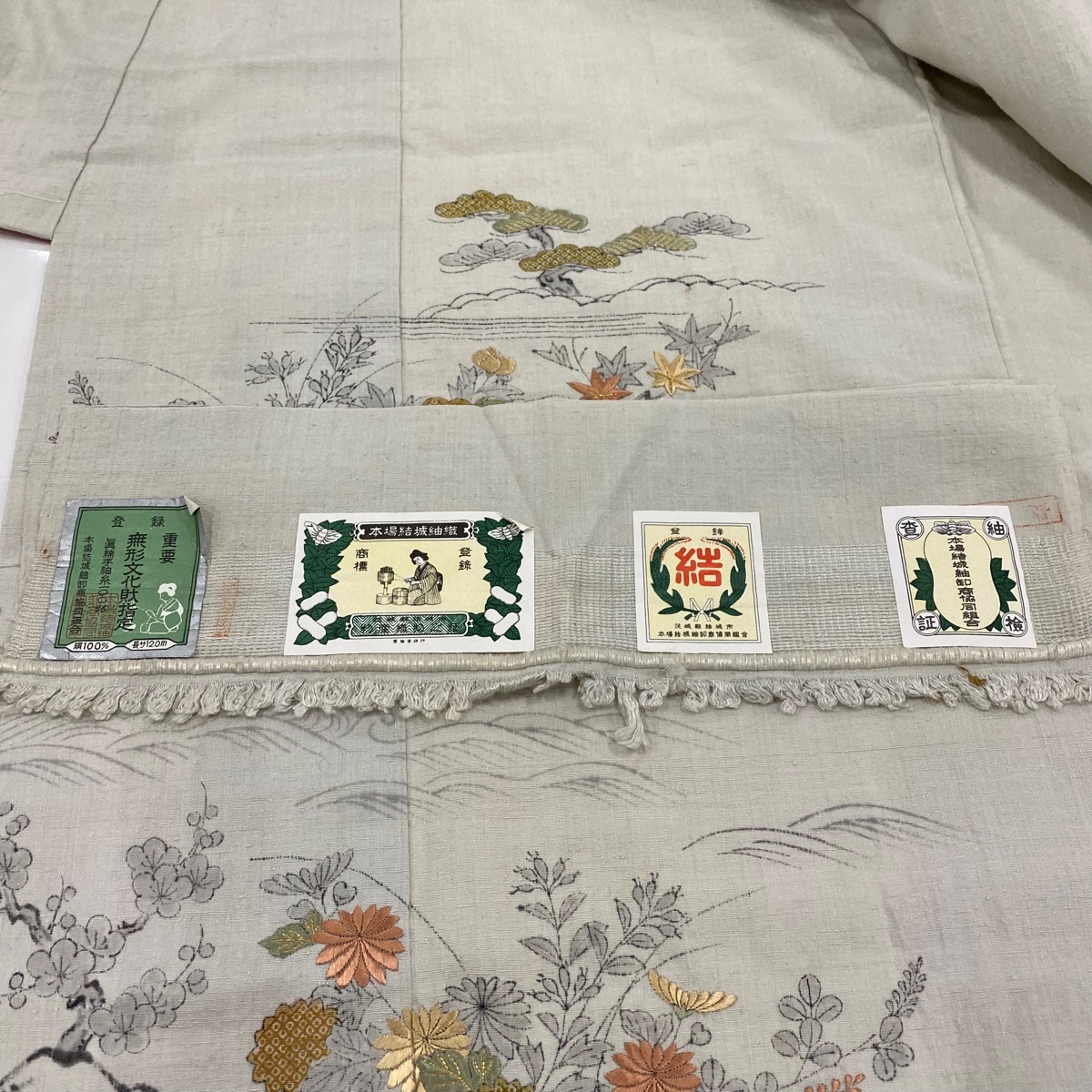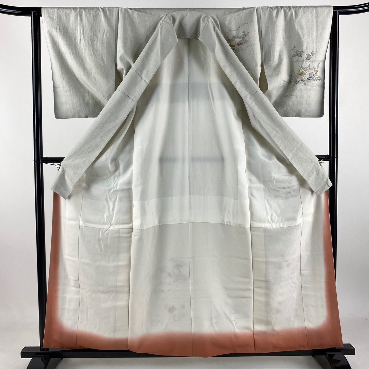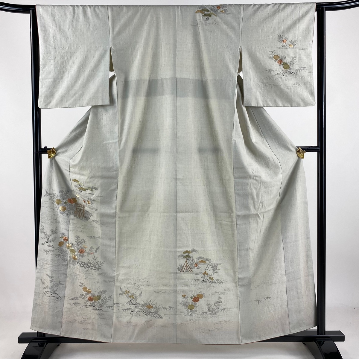 | 付下げ 秀品 証紙 紬地 草花 波頭 刺繍 金糸 灰色 袷 身丈159.5 裄丈64 M 正絹 【中古】 |