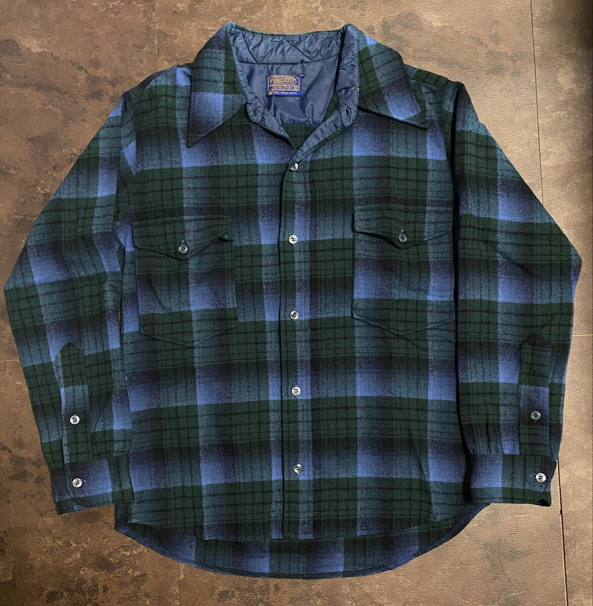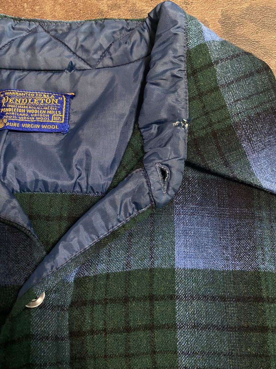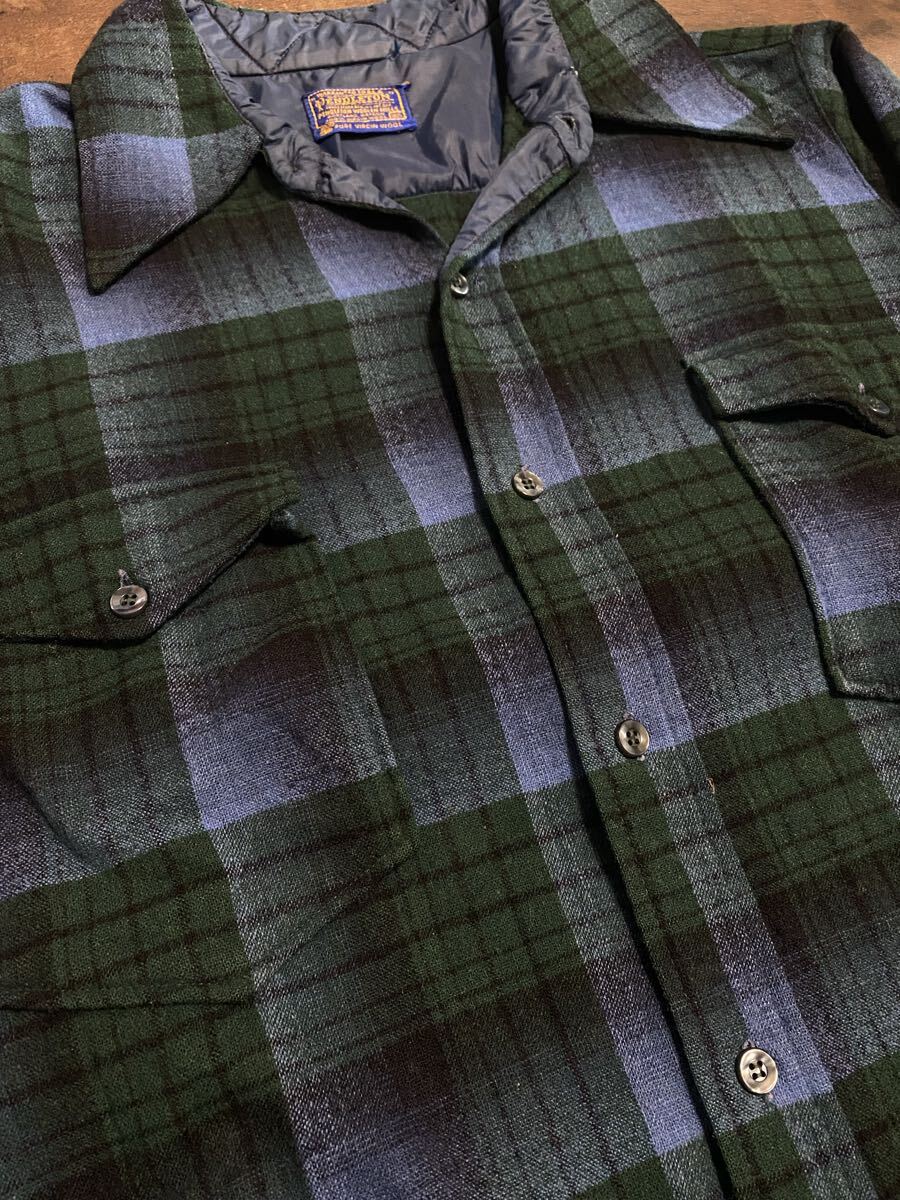 ペンドルトンの60年代製のヴィンテージオリジナルウールシャツです。お探しの方も多い青黒緑のシャドーチェックです。状態は襟元に小さな小穴がございます。良いコンディションです。なかなか見ない配色で人気が高い印象です。お好きな方はぜひ。