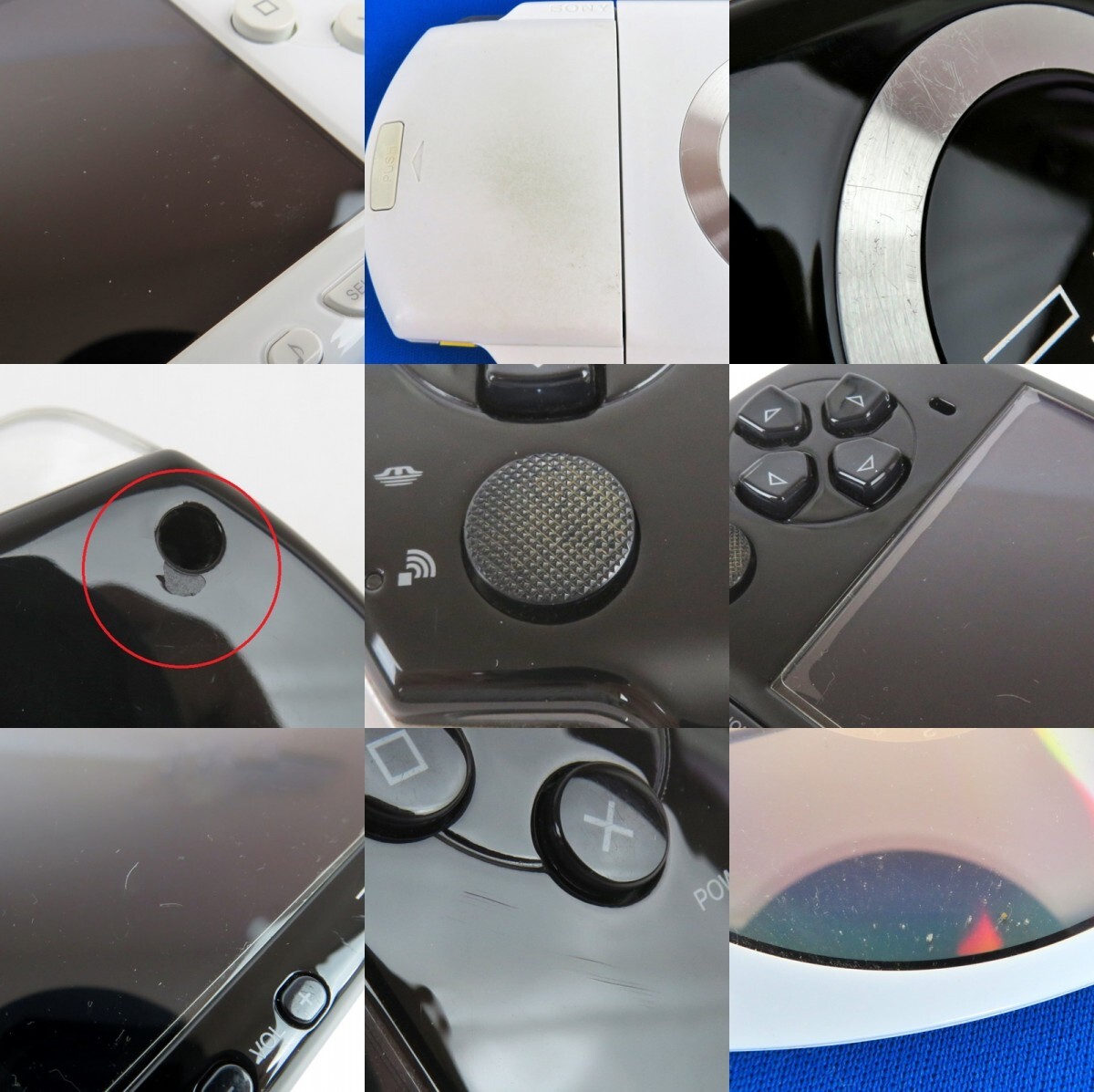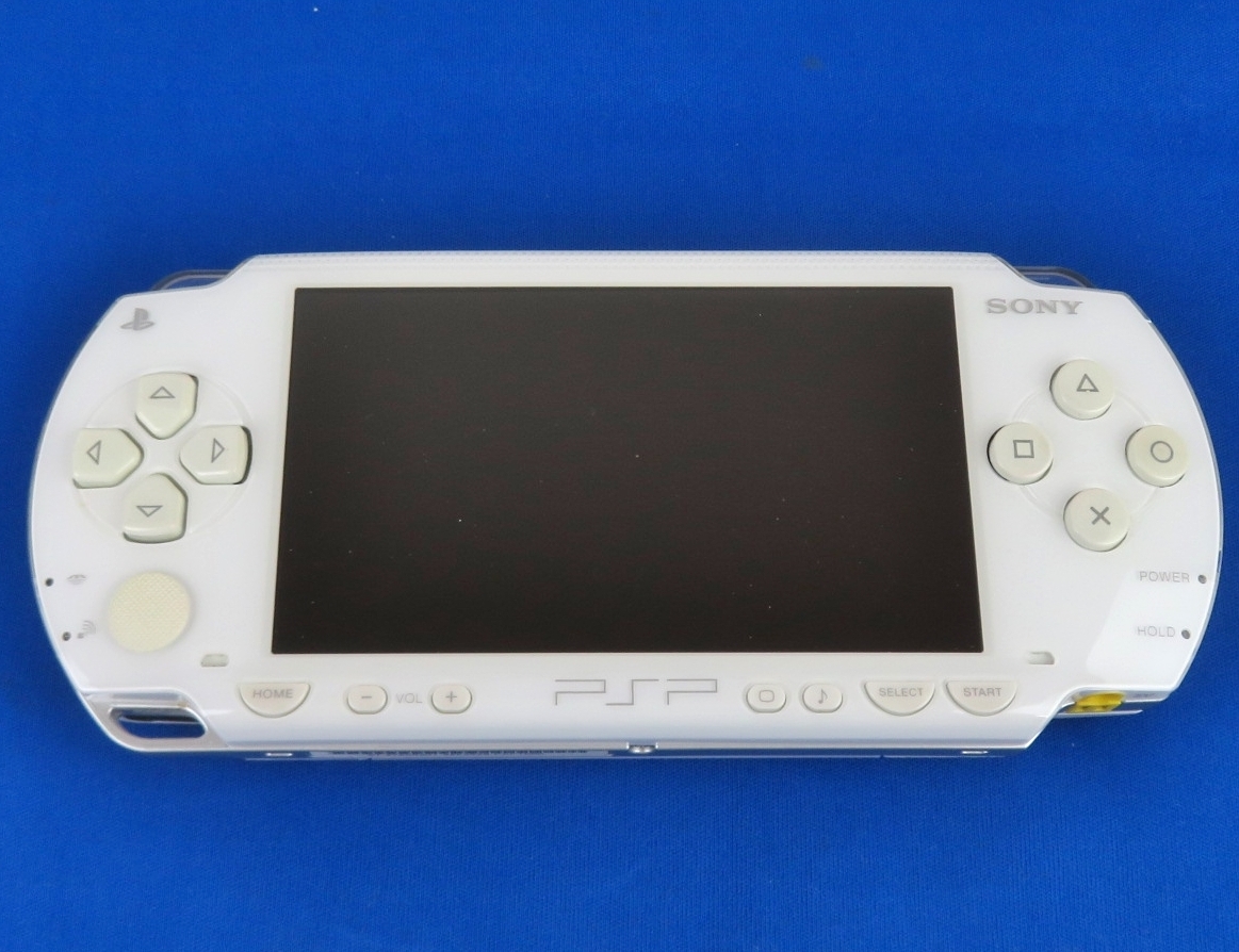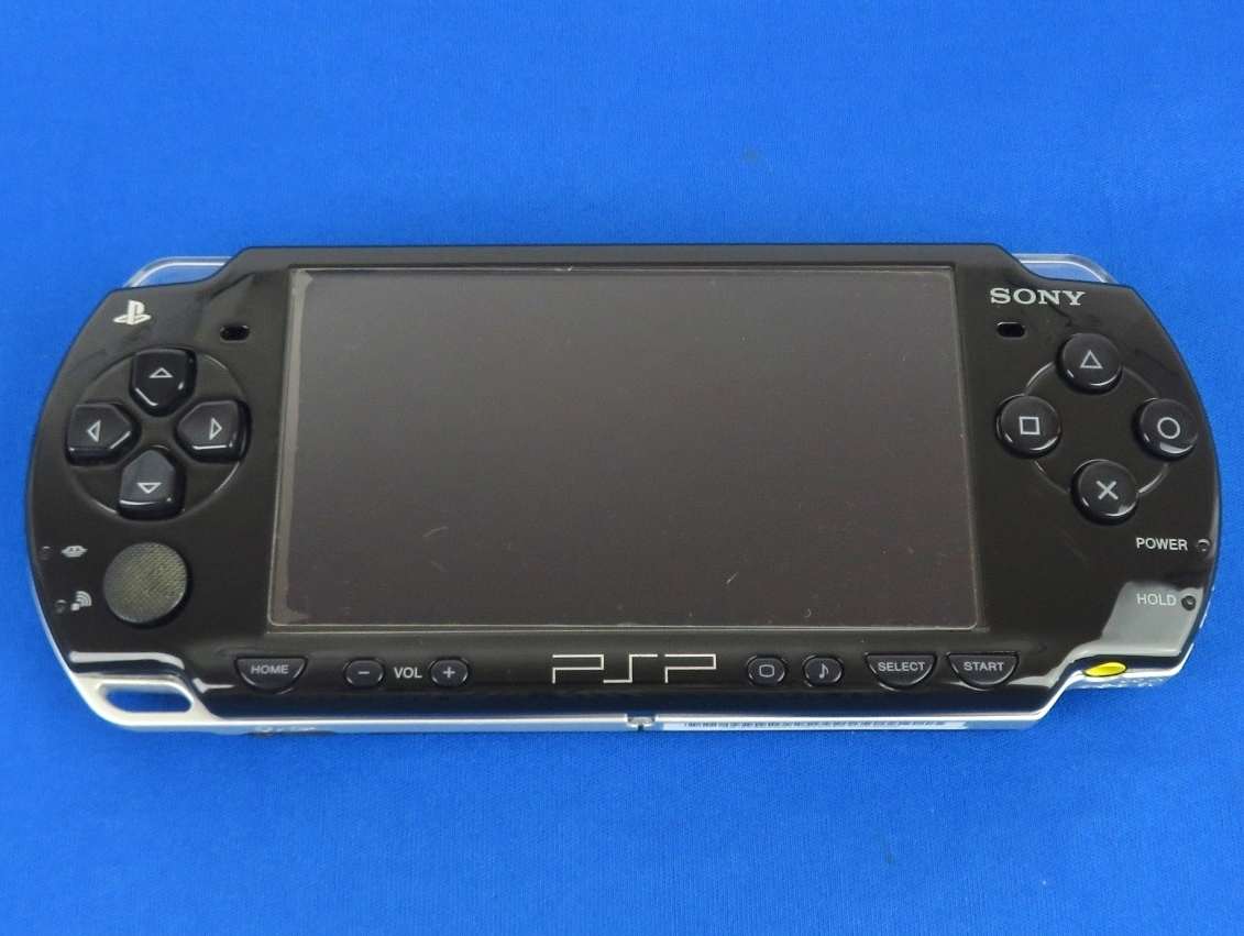 ブラックのPSPの画面には保護シートが貼られていますが、端の浮きや小傷が見られます。