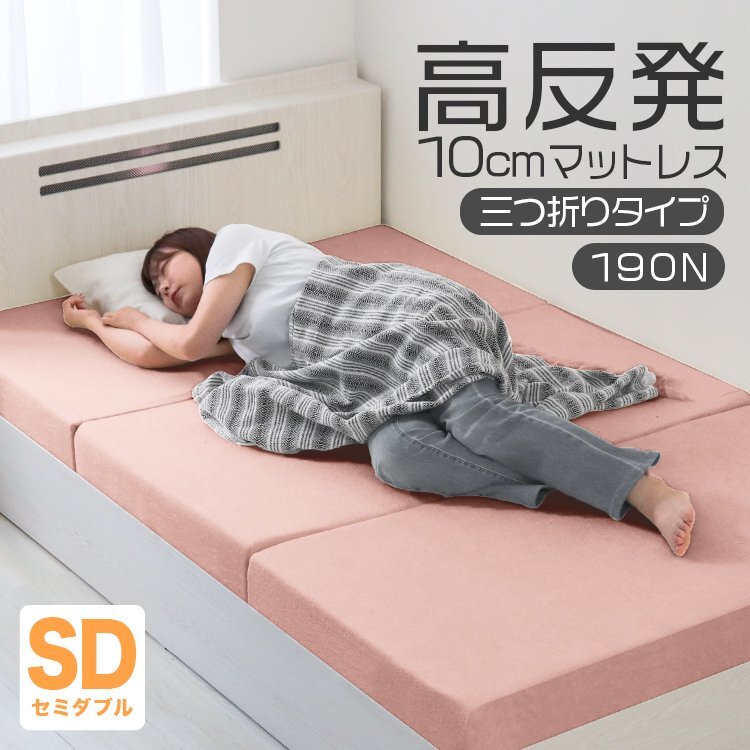 腰をやさしく支える高反発マットレスです。 厚みたっぷり10cmで、1枚でも底付き感のない寝心地。 高反発マットレスは下からの跳ね返りの力により、沈み込みが少ないのが特徴です。 その為、寝返りがうちやすく就寝時の身体の一部分(首・肩・腰・足)にかかる体圧も分散。 寝返りが多い方や仰向けに寝ることが多い方にオススメです。 三つ折りタイプは、押入れなどに収納しやすく、立て掛けておいても場所をとりません。 カバーは取り外して洗濯することができます。 【商品仕様】 ・カラー:アッシュピンク ・サイズ:(約)幅120×奥行き195×厚さ10cm(セミダブル) ・重量:(約)7.2kg ・硬さ:190ニュートン ・素材: マットレス本体:高反発ウレタン カバー:ポリエステル100% 【注意事項】 ・圧縮梱包されたままの状態で長期間保管した場合、マットレスが復元できなくなってしまいます。商品到着後、1週間以内に必ず圧縮から開放をして頂くようにお願いいたします。 ・マットレスは約1-2日で復元します。気温や温度により3-14日かかる場合もあります。 ・製品の臭いが気になりましたら、風通しの良いところで脱臭してください。この臭いは素材のウレタンによるもので無害です。臭いに敏感な方は十分ご検討の上、ご購入をお願いいたします。 ・マットの硬さは温度によって変わってきます。また、硬さの感じ方には個人差があります。 ・カバーは取り外して洗濯ができますが、マットレス本体は洗濯しないでください。 ・仕様・デザインは改良のため予告なく変更することがあります。 |