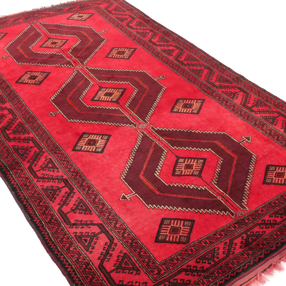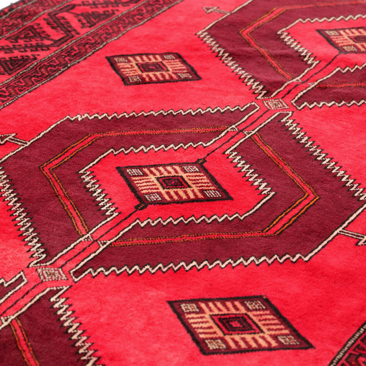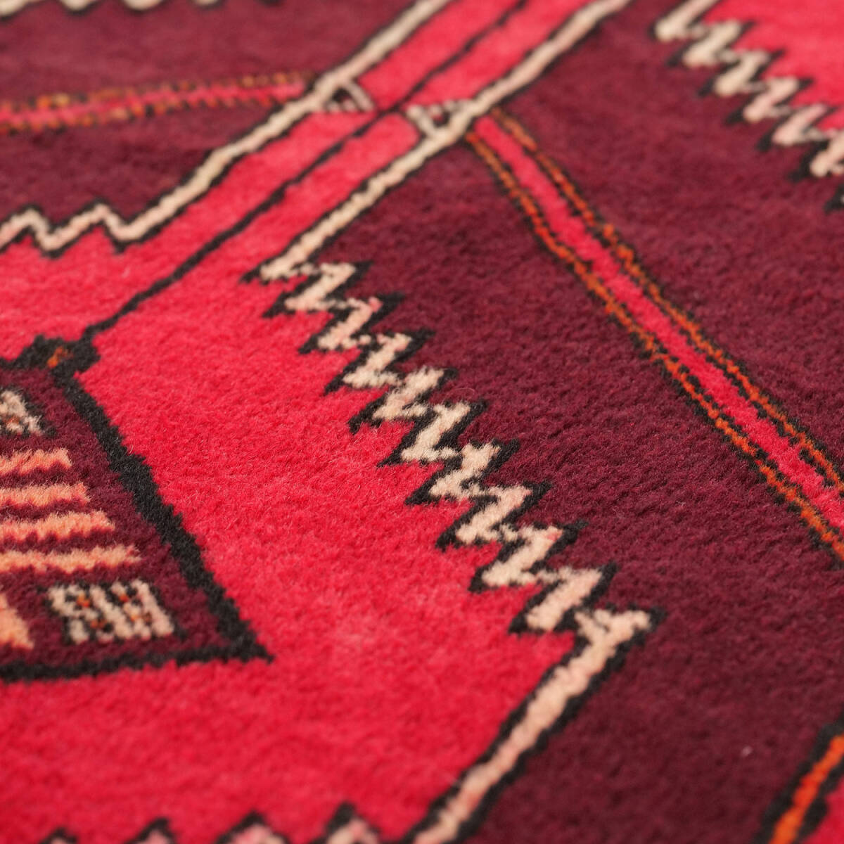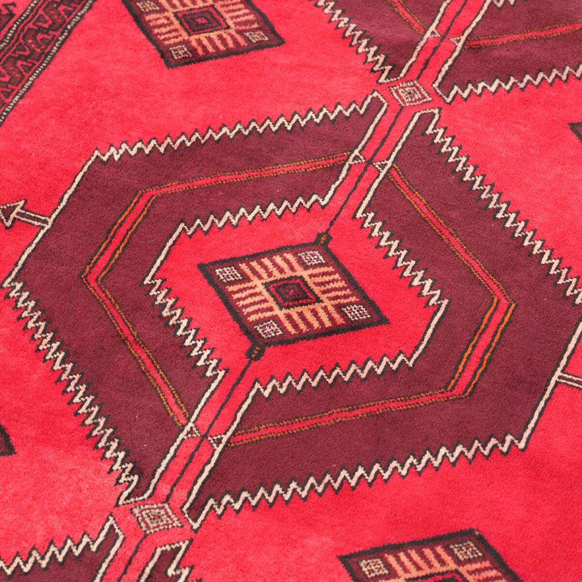 1960年代に制作されたサラフス産のセミアンティークラグです。中央に連なる大きなダイヤモンドモチーフは、エルサリギュルの影響を受けた構成で、古典的な力強さと現代的な洗練を併せ持っています。対称的な文様の連なりが空間に奥行きを与え、和洋どちらのインテリアにも映える一枚です。サイズは2430×1400mmで、リビングや寝室、ギャラリーなどに最適です。