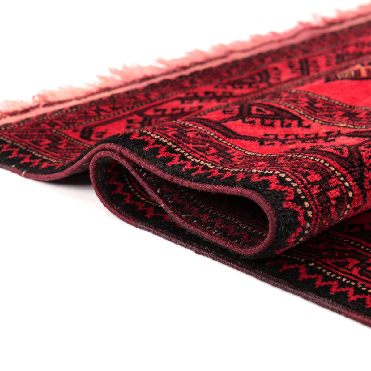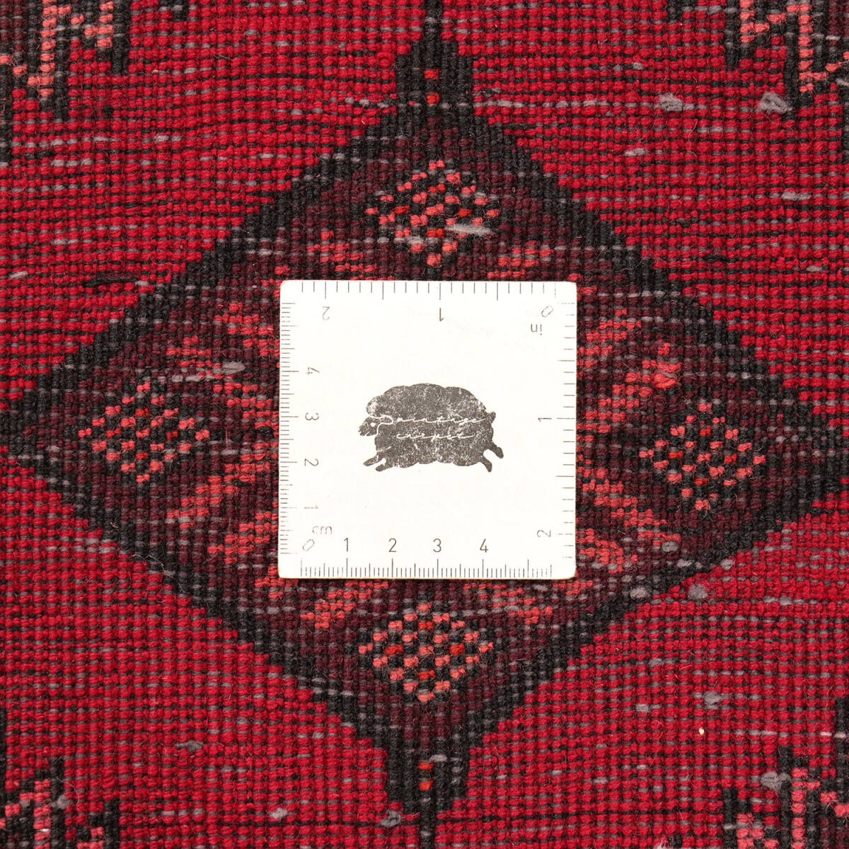 深みのある赤を基調に、黒と茶の濃淡が文様を引き締めています。経年により赤が柔らかく熟成し、落ち着きと温かみを感じさせる風合いです。