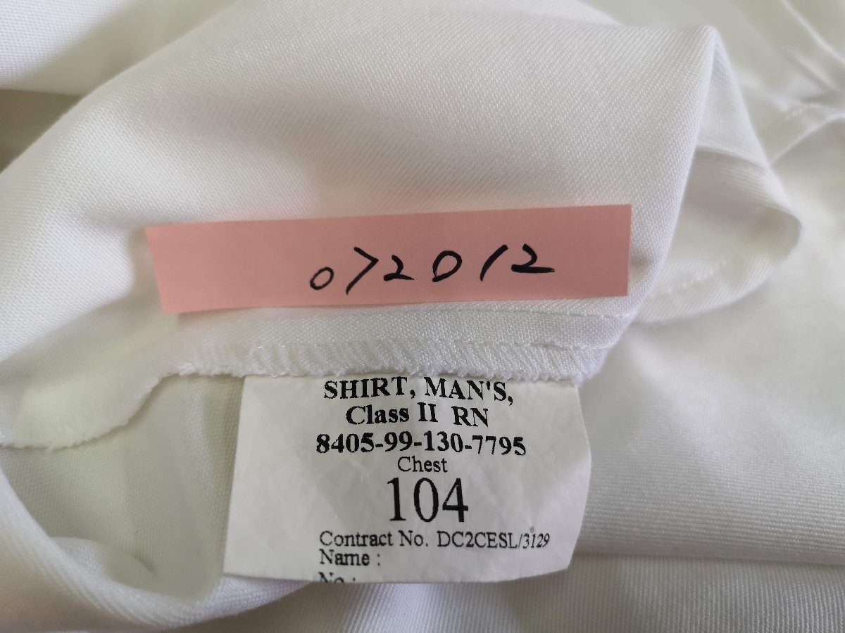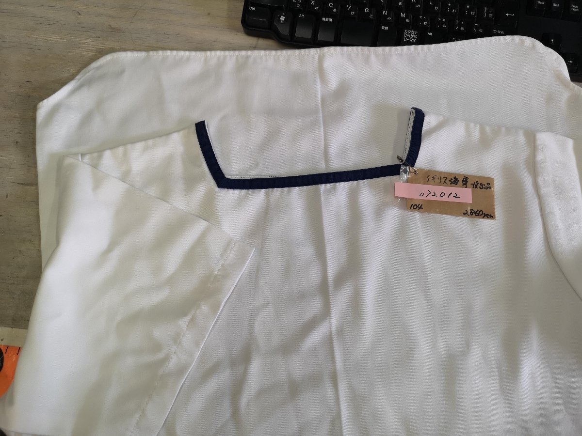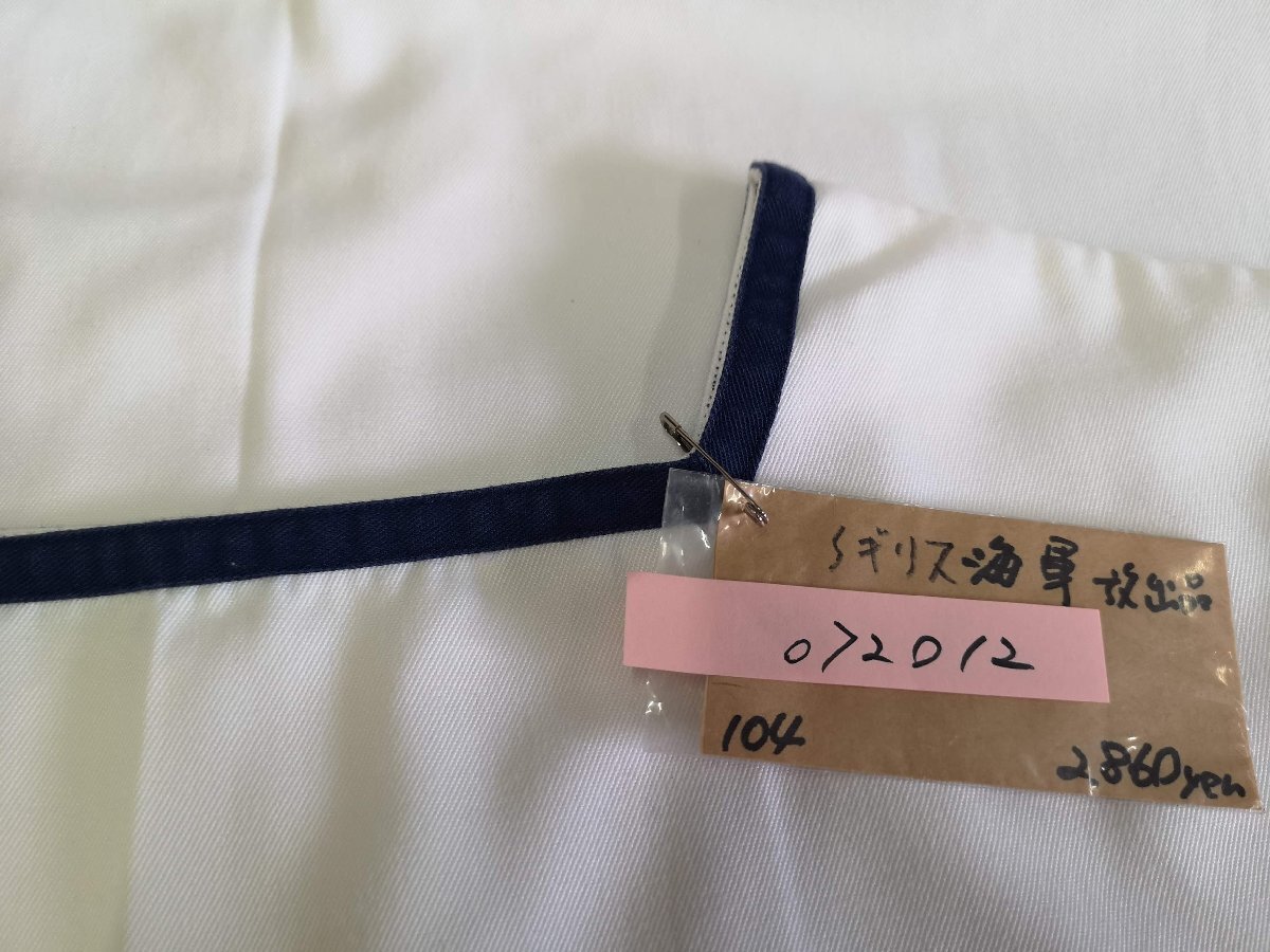 1枚目の写真は流用です。 未使用品らしいですが、白ですので若干の保管時の汚れがあります。イギリス海軍のせーらーTシャツでなかなかレアな一品になります。 素材はおそらく綿ポリで首周りだけネイビーの縁取りがされています。前後の違いのないデザインです。 サイズ表示は104で丈73cm、身幅53センチ、肩幅45cm程度。 クロネコネコポス便200円でお送りいたします、落札価格にプラスでお願いいたします。
