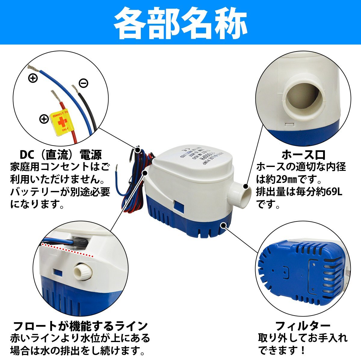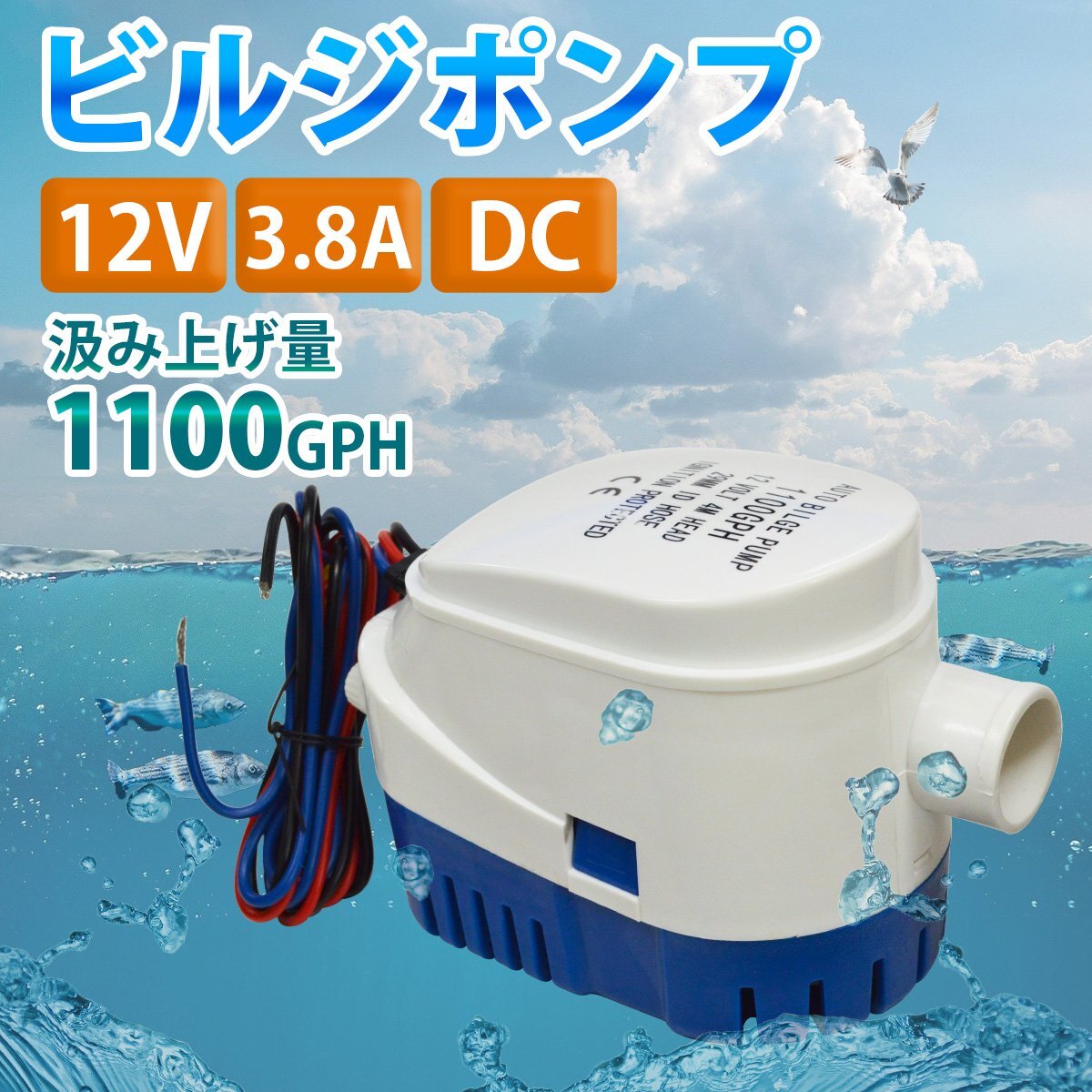 12V ビルジポンプ 1100GPH フロート スイッチ 一体型 毎分70L 水中 ポンプ 船 ボート ヨット 船舶 漁船 汲み上げ 自動排水