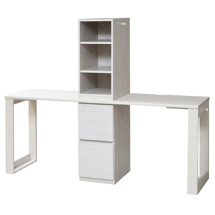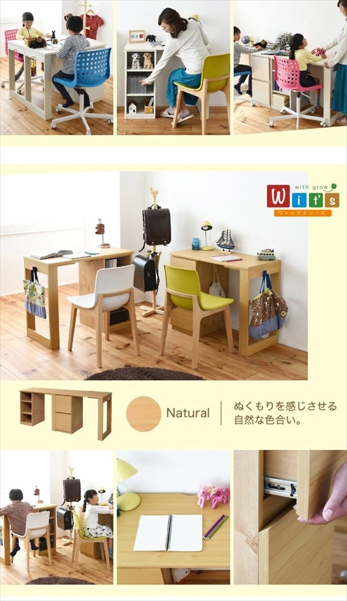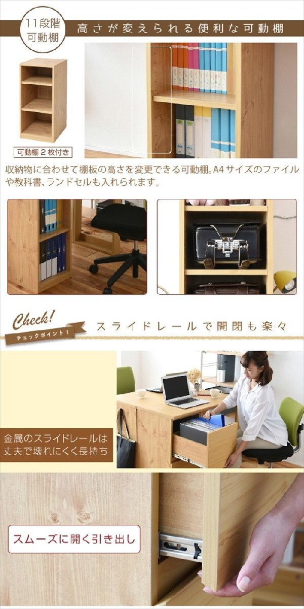 | 木目調が優しい印象を与えるホワイトとナチュラルの2カラー。 ラックとチェストがついている省スペースなデスク。 積み重ねても横に並べてもいいので自由に使えます。 A4ファルや教科書が入る便利な設計。 |
