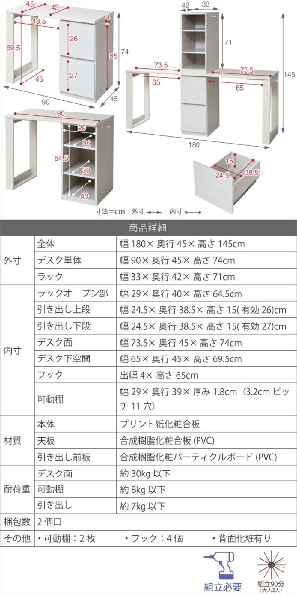 | □外寸 [全体]幅180×奥行45×高さ145cm [デスク単体]幅90×奥行45×高さ74cm [ラック]幅33×奥行42×高さ71cm □内寸 [ラックオープン部]幅29×奥行40×高さ64.5cm [引き出し上段]幅24.5×奥行38.5×高さ15(有効26)cm [引き出し下段]幅24.5×奥行38.5×高さ15(有効27)cm [デスク面]幅73.5×奥行45×高さ74cm [デスク下空間]幅65×奥行45×高さ69.5cm [フック]出幅4×高さ65cm [可動棚]幅29×奥行39×厚み1.8cm(3.2cmピッチ11穴) |