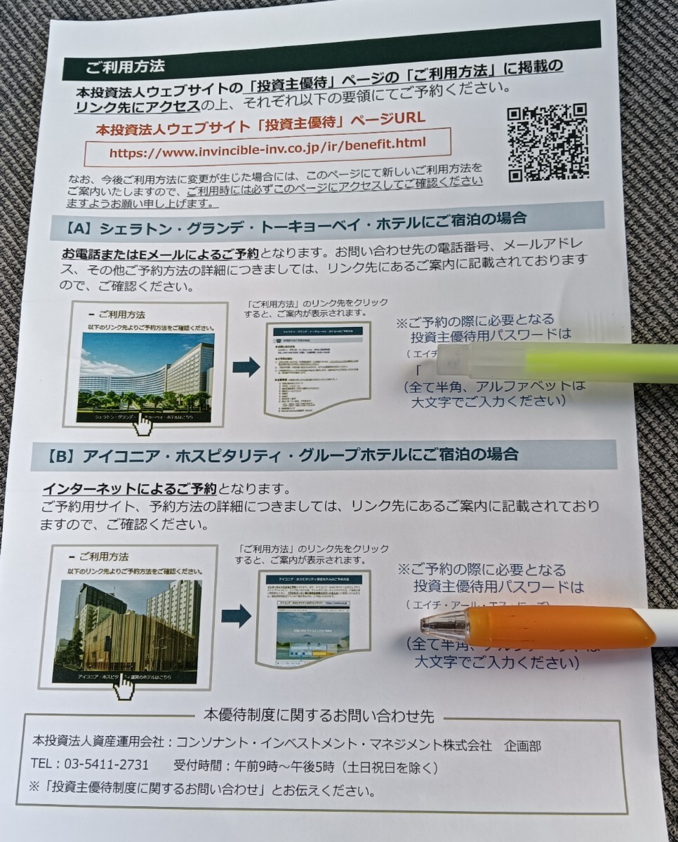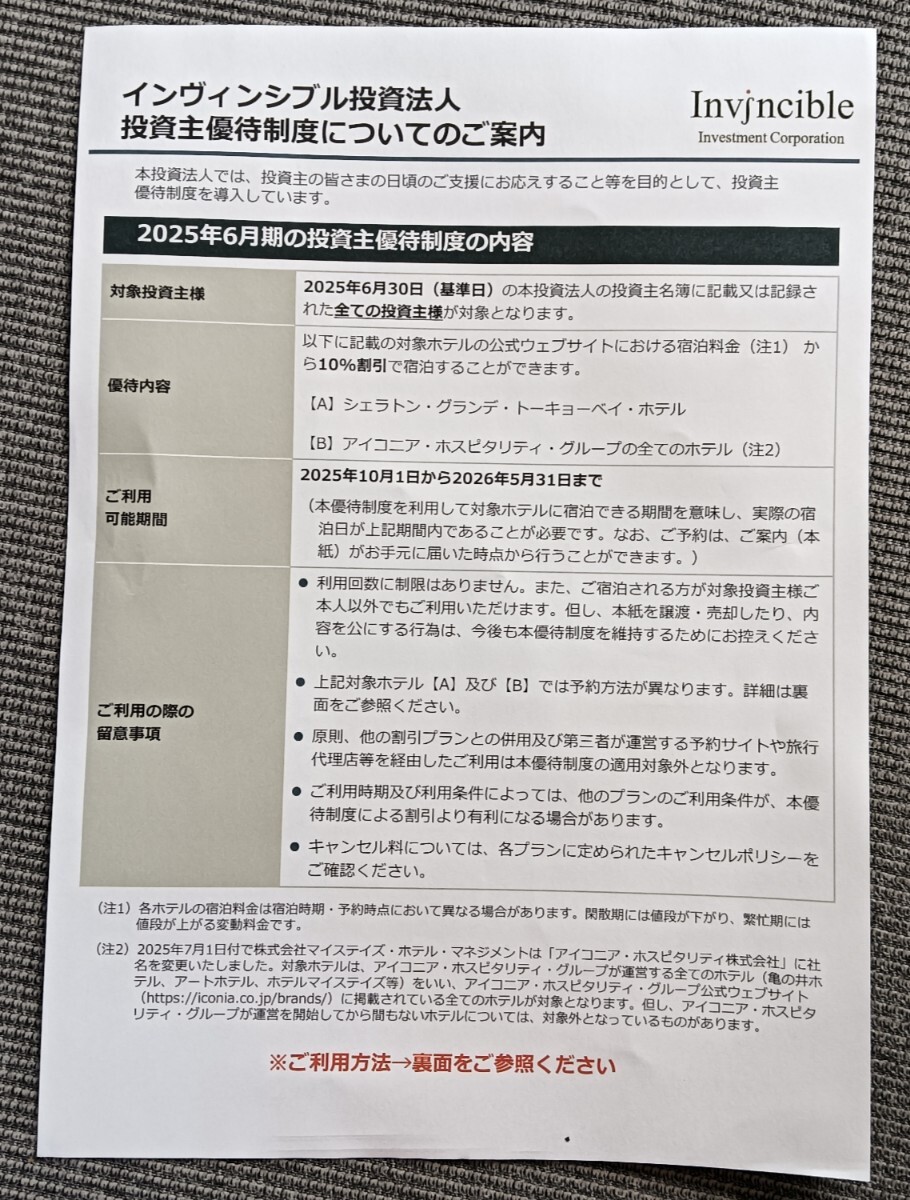 インヴィンシブル投資法人の株主優待権利、ホテル宿泊割引パスワードをお伝えいたします。